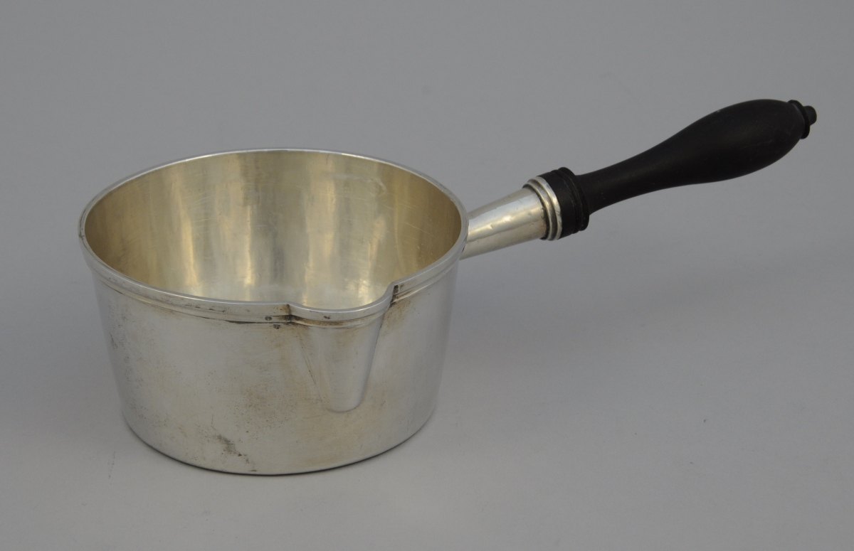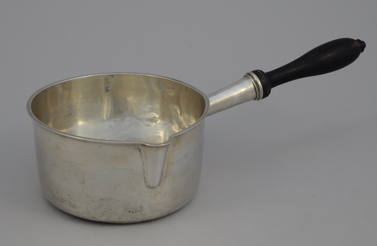 2 POÊLONS DE TABLE de forme circulaire en argent uni. Manche latéral en ébène tourné.