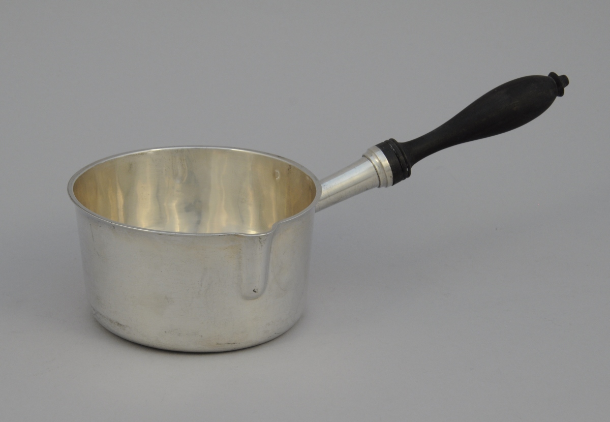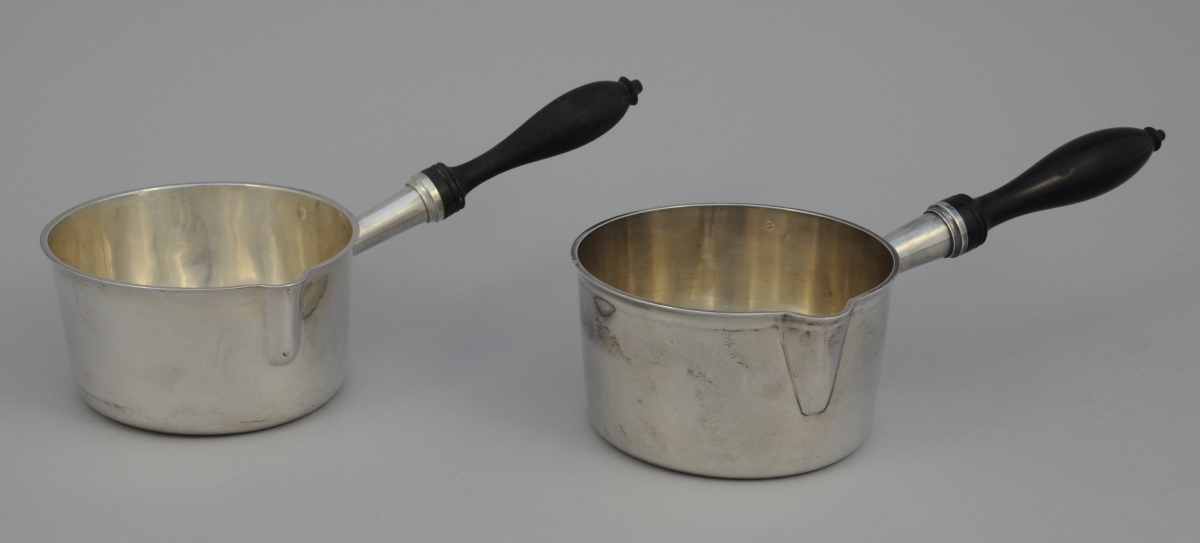 2 POÊLONS DE TABLE de forme circulaire en argent uni. Manche latéral en ébène tourné.