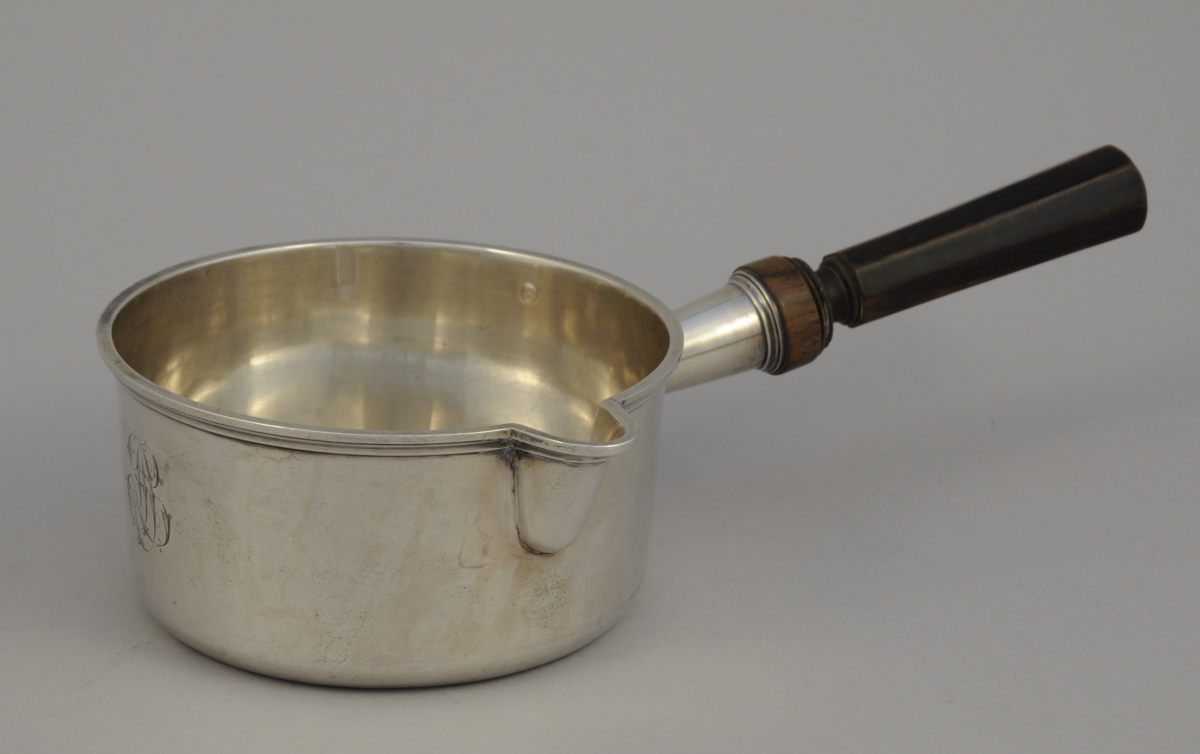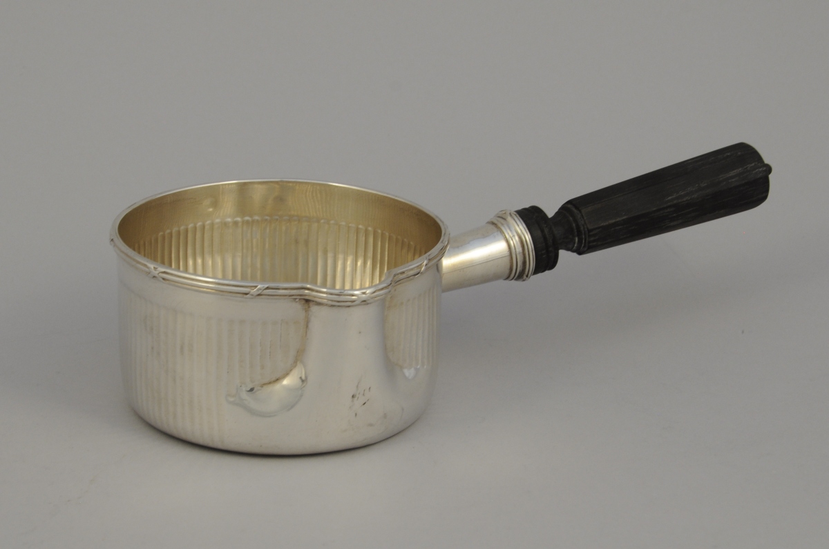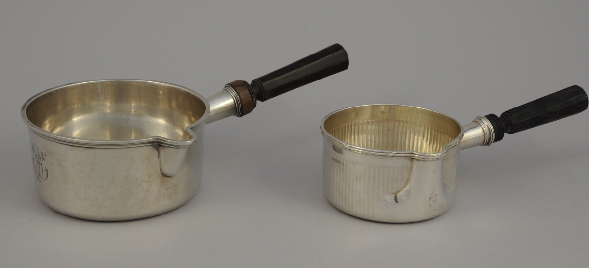 2 POÊLONS DE TABLE de forme circulaire en argent. Manche latéral en bois noirci ou en ébène à pans coupés. Le premier en argent uni monogrammé "DL", le second de style Louis XVI orné de cannelures, les bordures à décor de joncs rubannés.