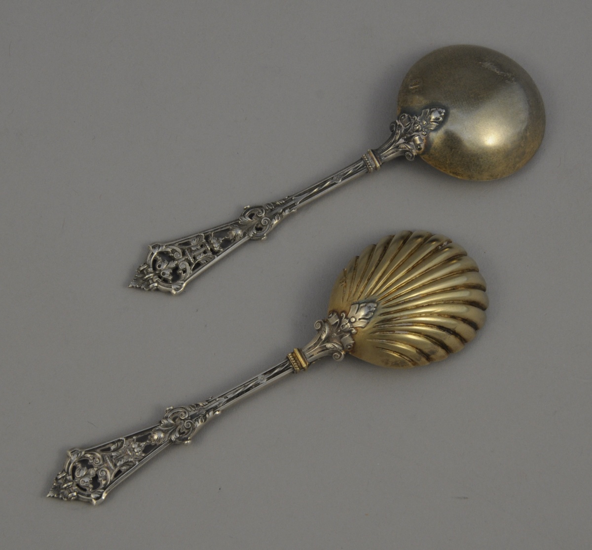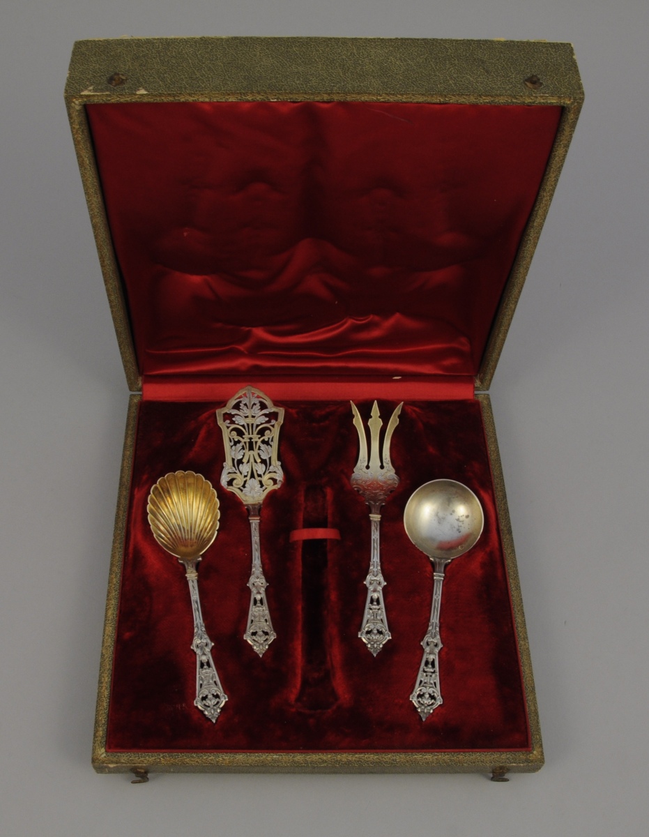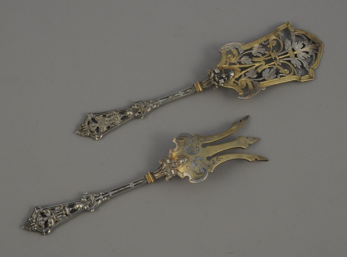 SERVICE À BONBONS, 4 pièces, en argent et vermeil. Beau modèle à décor ajouré d'agrafes, fleurons et feuillages stylisés. Il se compose d'une pelle, d'une fourchette et de deux cuillères. L'une à cuilleron coquille, l'autre rond.