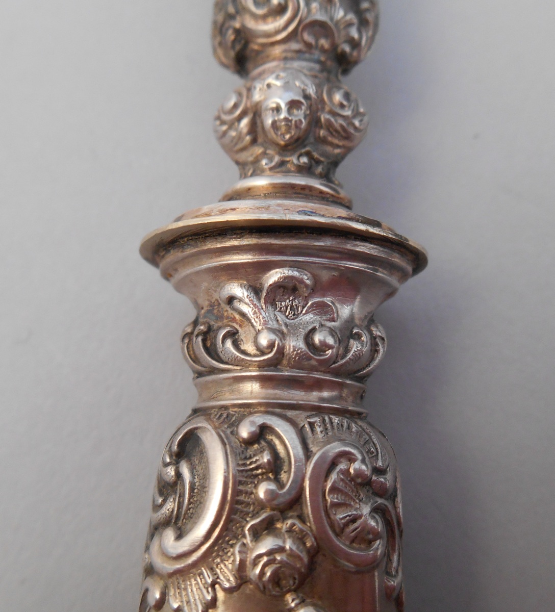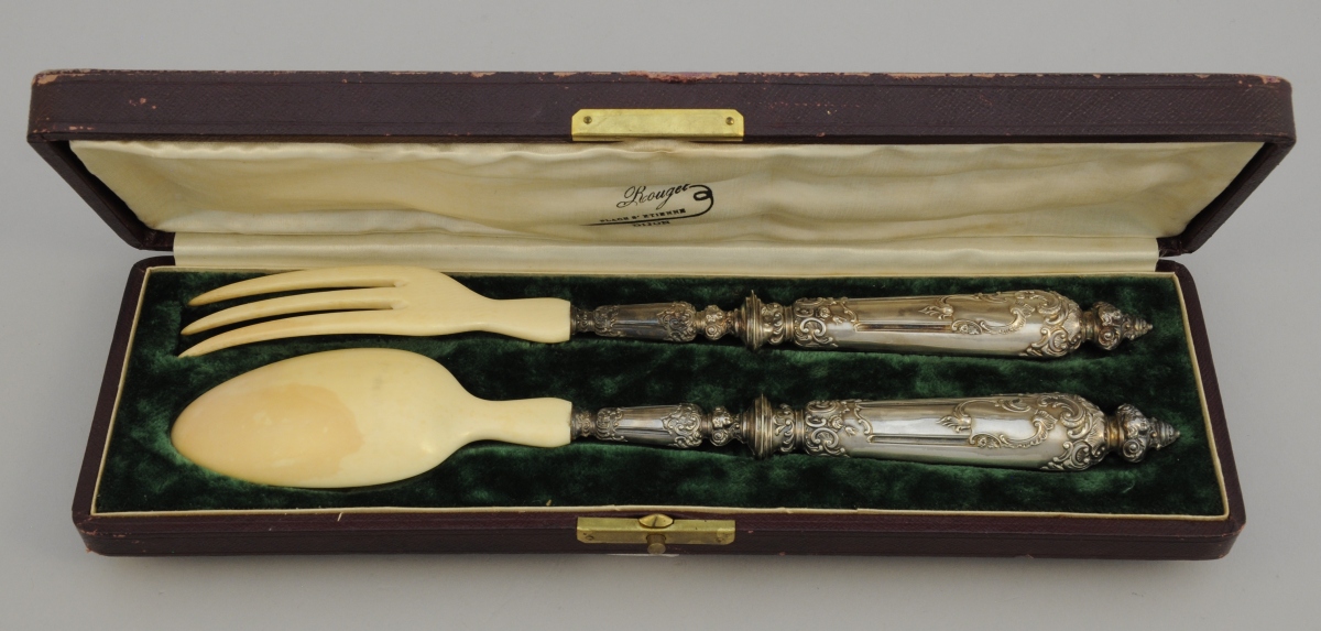 COUVERT DE SERVICE À SALADE en argent et ivoire. Manches en argent fourré à riche décor de têtes de putti, agrafes feuillagées, coquilles fleurs et volutes.