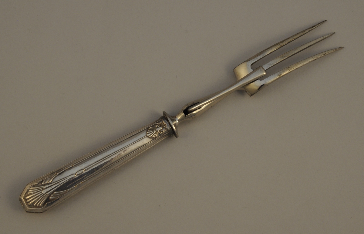 JOINT: FOURCHETTE DE SERVICE À DÉCOUPER. MAnche en argent fourré à décor géométrisant de palmettes. Fourchon en acier. Poinçon Minerve. XXème. Poids brut: 115 g.