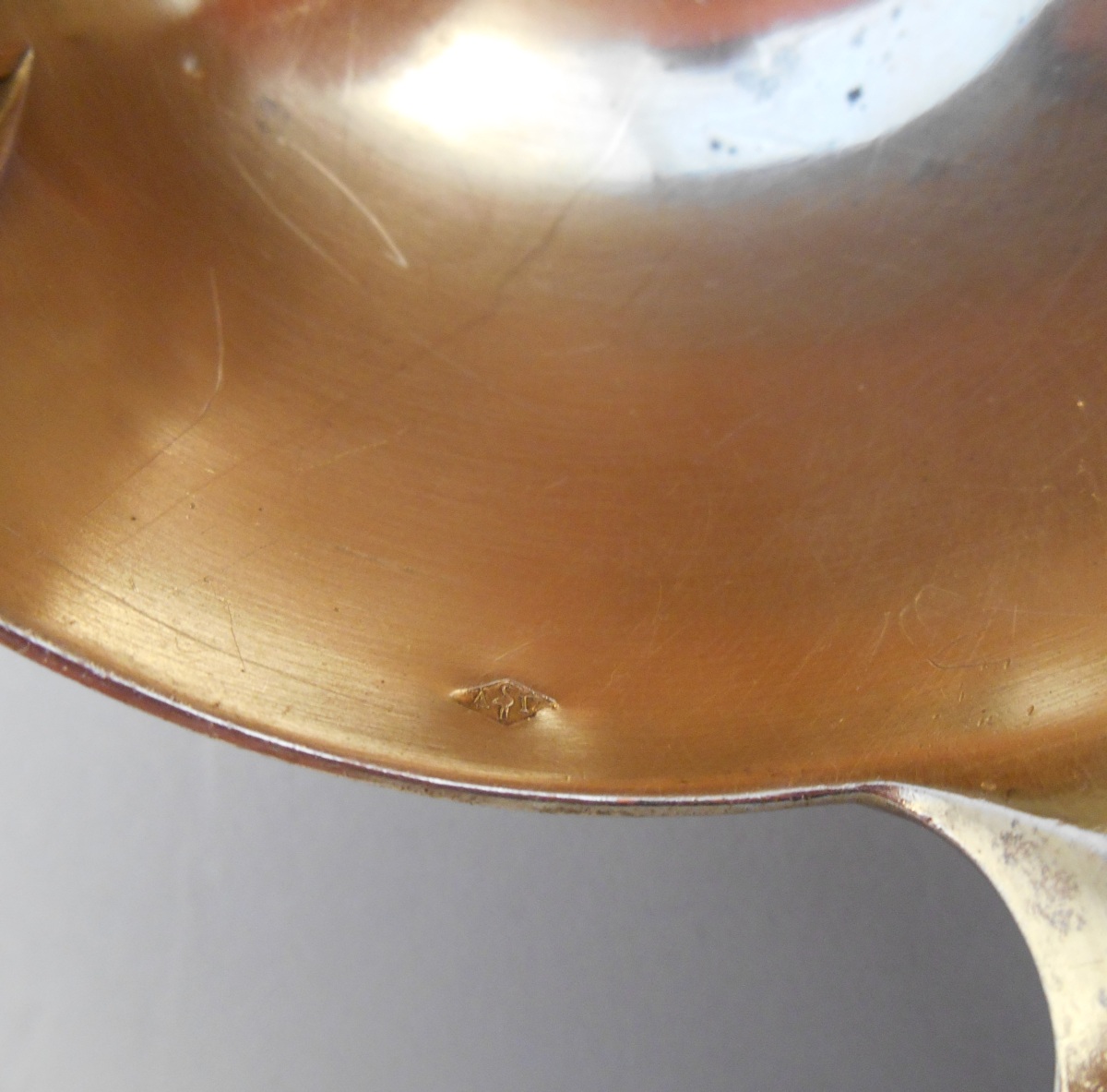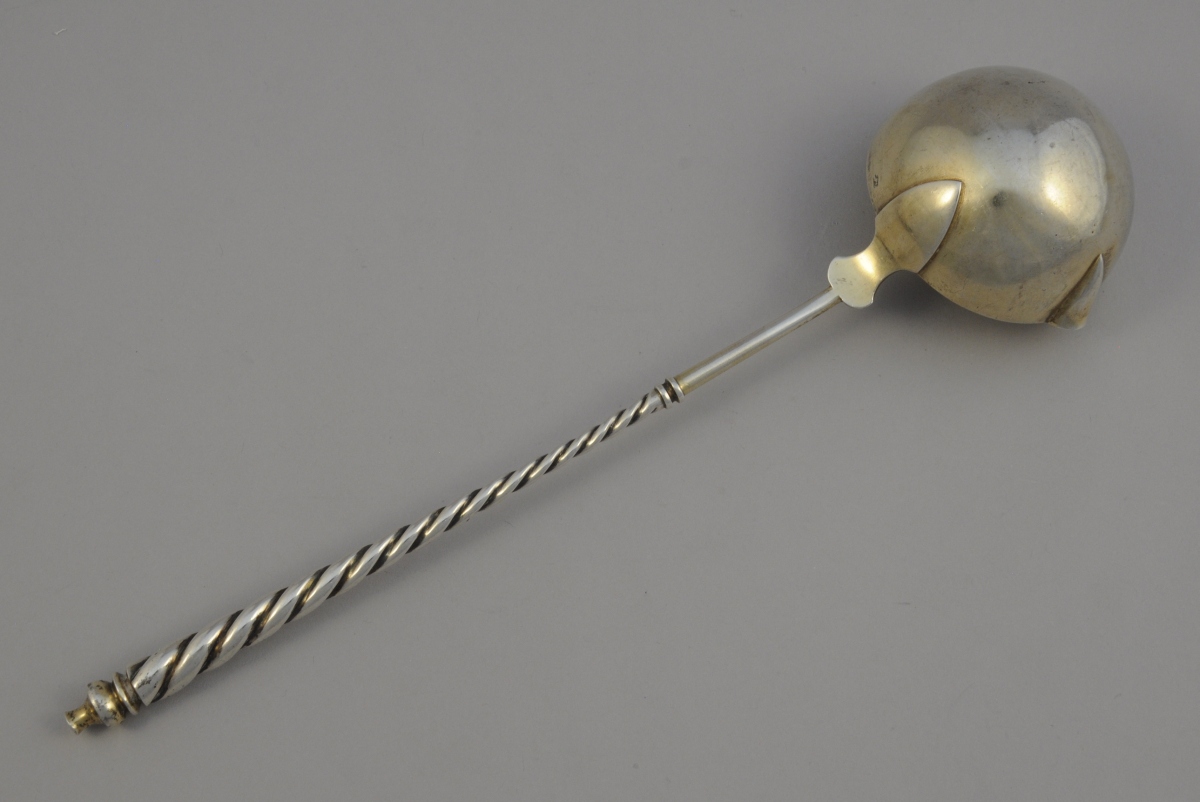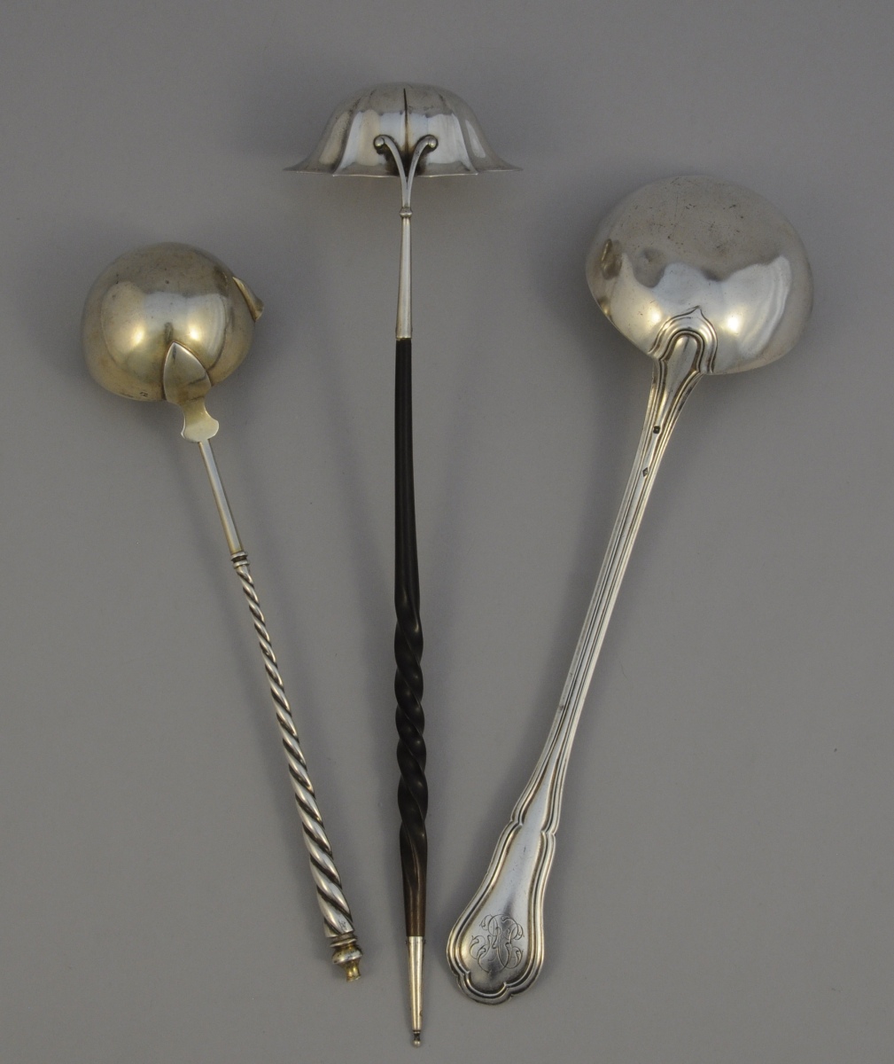 -Louche à punch, manche torse. Louchon à bec de forme ronde en vermeil. Poinçon Minerve. Fin XIXème. Maître-orfèvre: Alphonse Debain, fabricant orfèvre au 79, rue du Temple à Paris. Poids: 140 g.