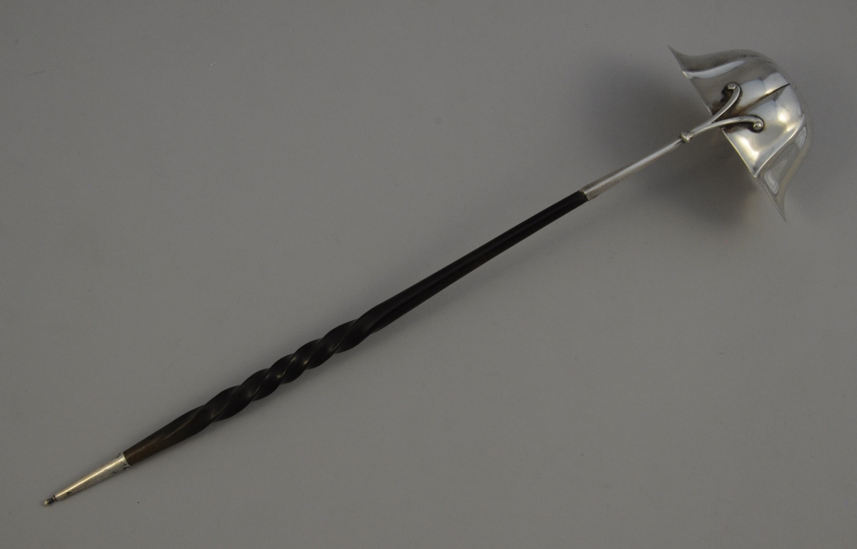 -Louche à punch, manche en corne torsadé. Louchonn de forme ovale à côtes pincées et bordure chantournée. Travail étranger. Fin XIXème, début XXème. Poids brut: 70 g.