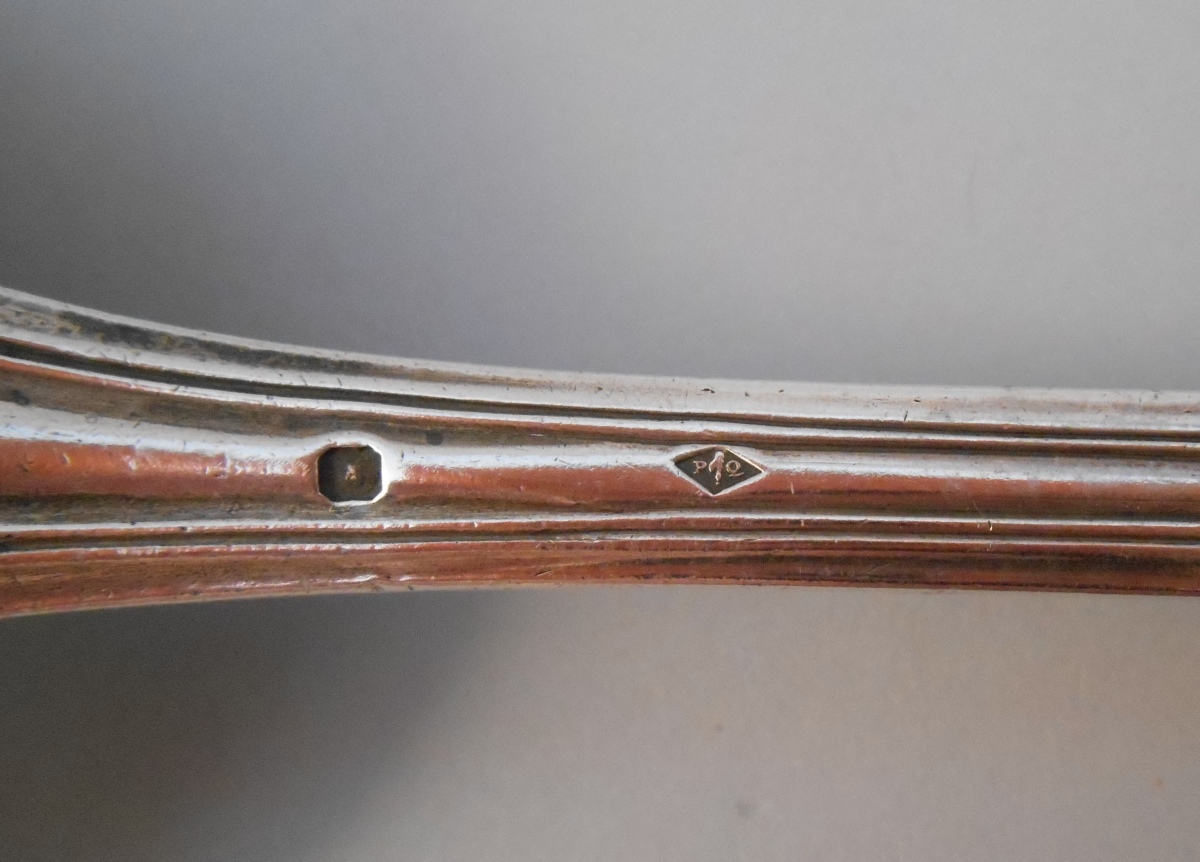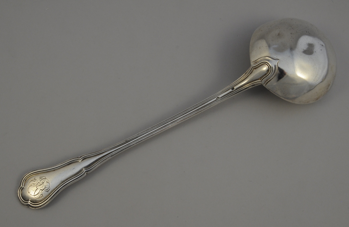 -Louche, modèle filets-contour. La spatule chantournée monogrammée "NJ". Poinçon Minerve. Style Louis XV, XIXème. Poids: 240 g. (chocs)