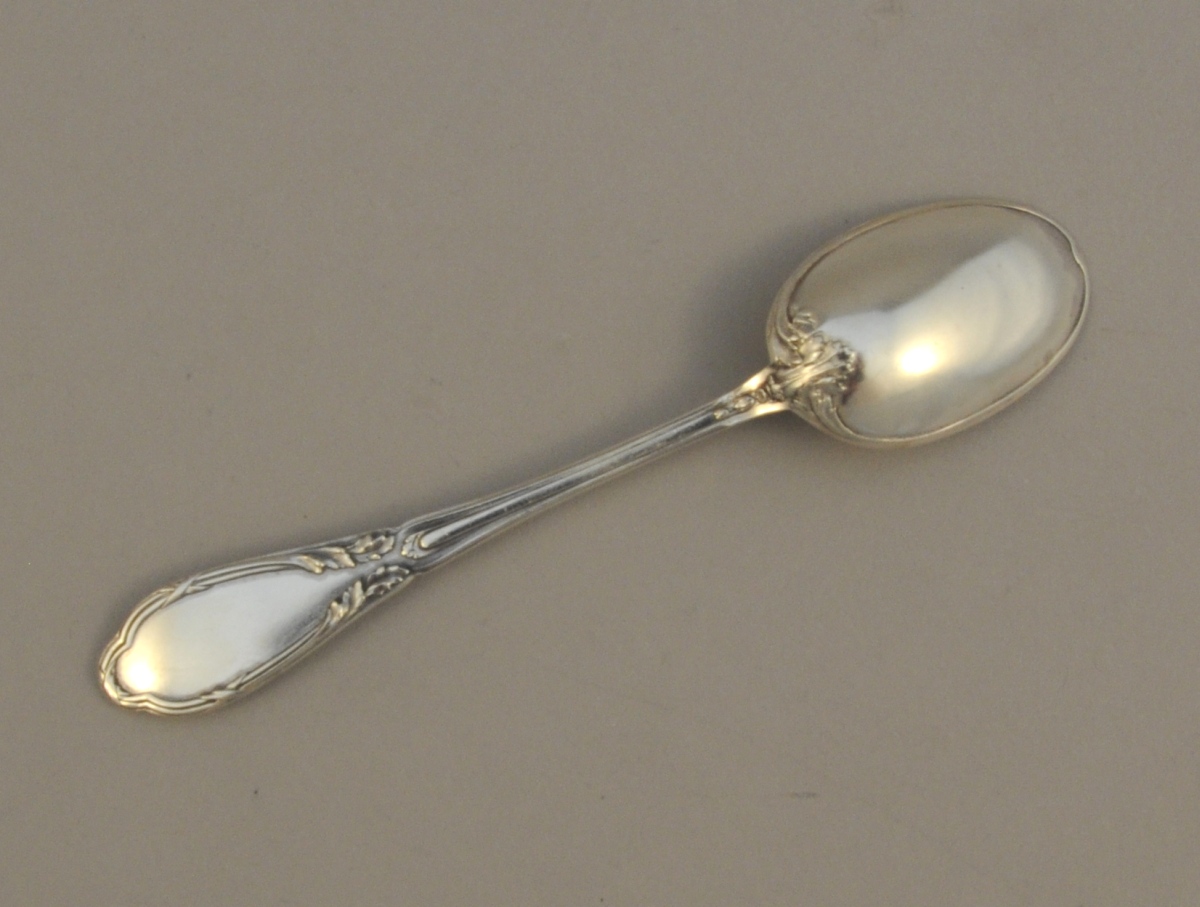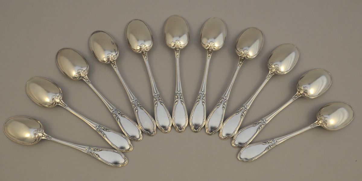 Suite de 11 CUILLÈRES À CAFÉ en argent. Décor de joncs rubannés et feuilles d'acanthe stylisées.