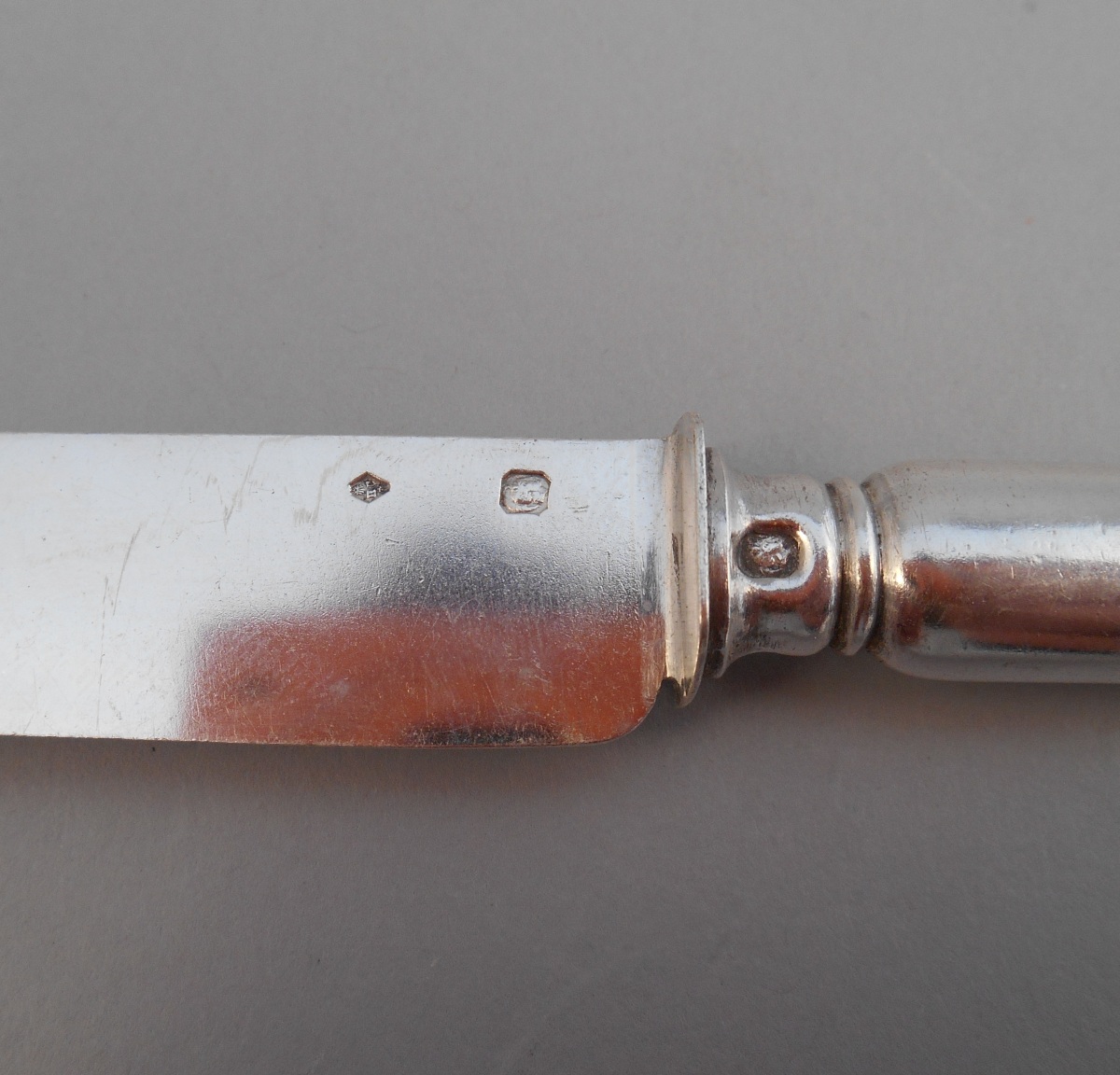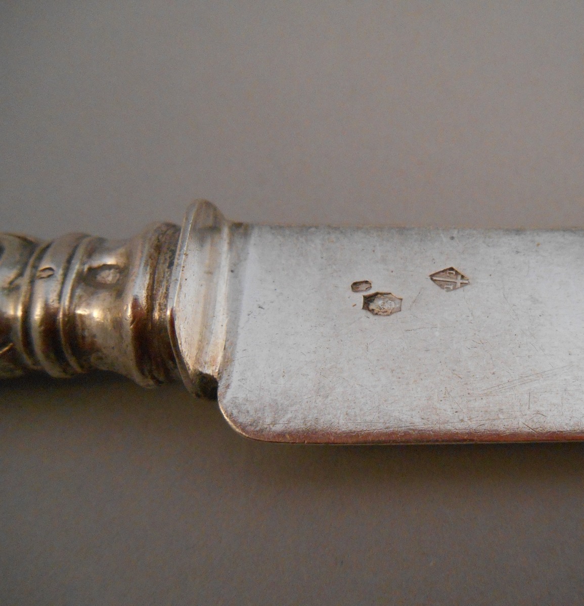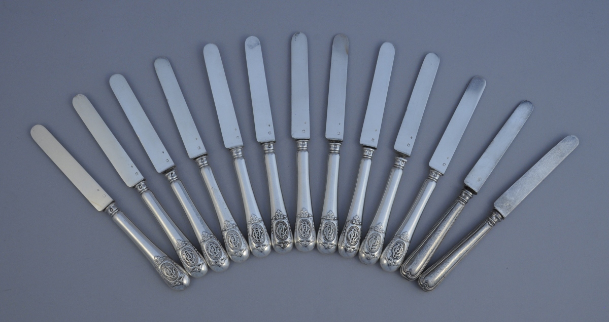 Suite de 11 COUTEAUX À FRUITS en argent. Le manche en argent fourré orné d'un cartouche feuillagé monogrammé "PC".