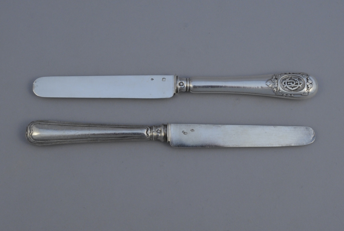 JOINT: 2 COUTEAUX À FRUITS, modèle filets-contour. Poinçon Mercure (exportation). Style Louis XV, fin XIXème, début XXème. Poids brut: 90 g. (en l'état)