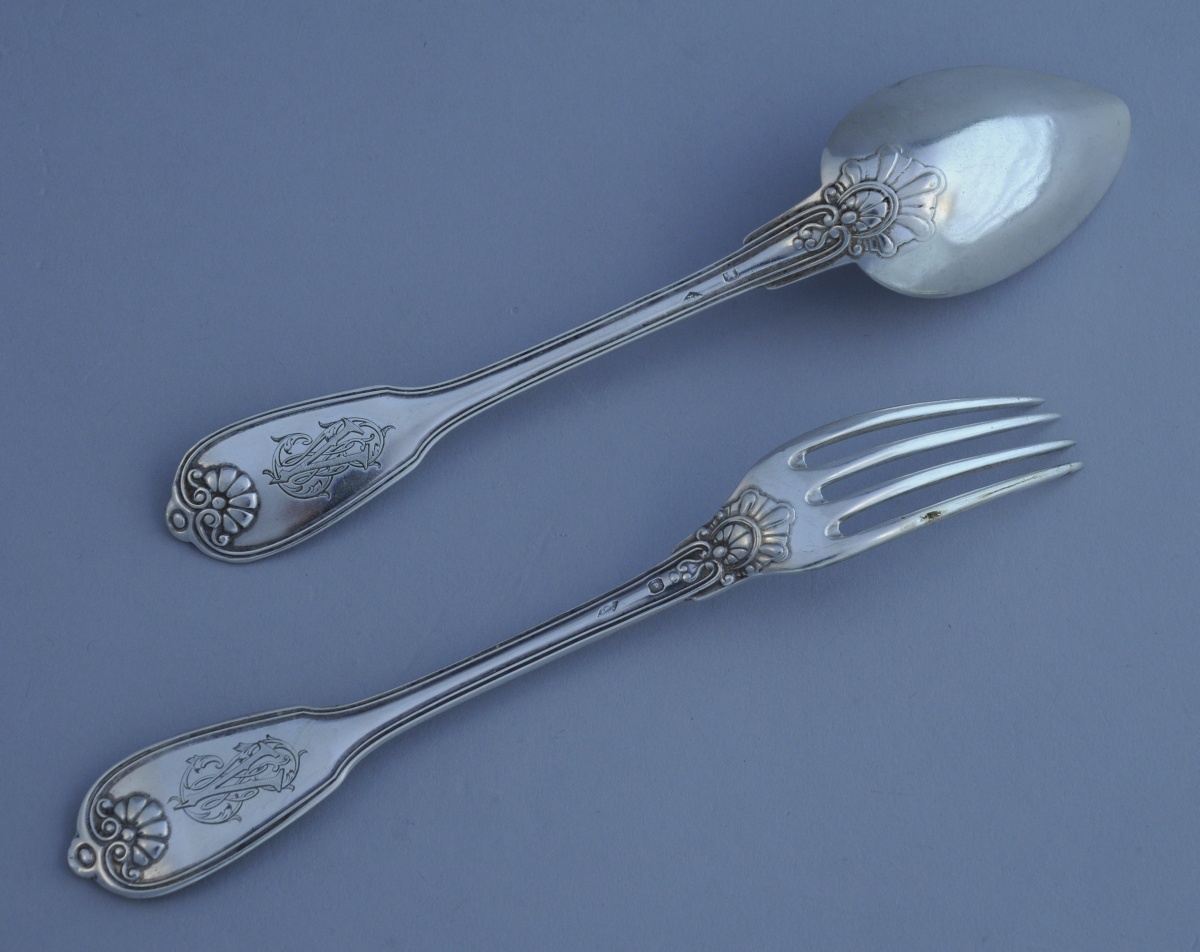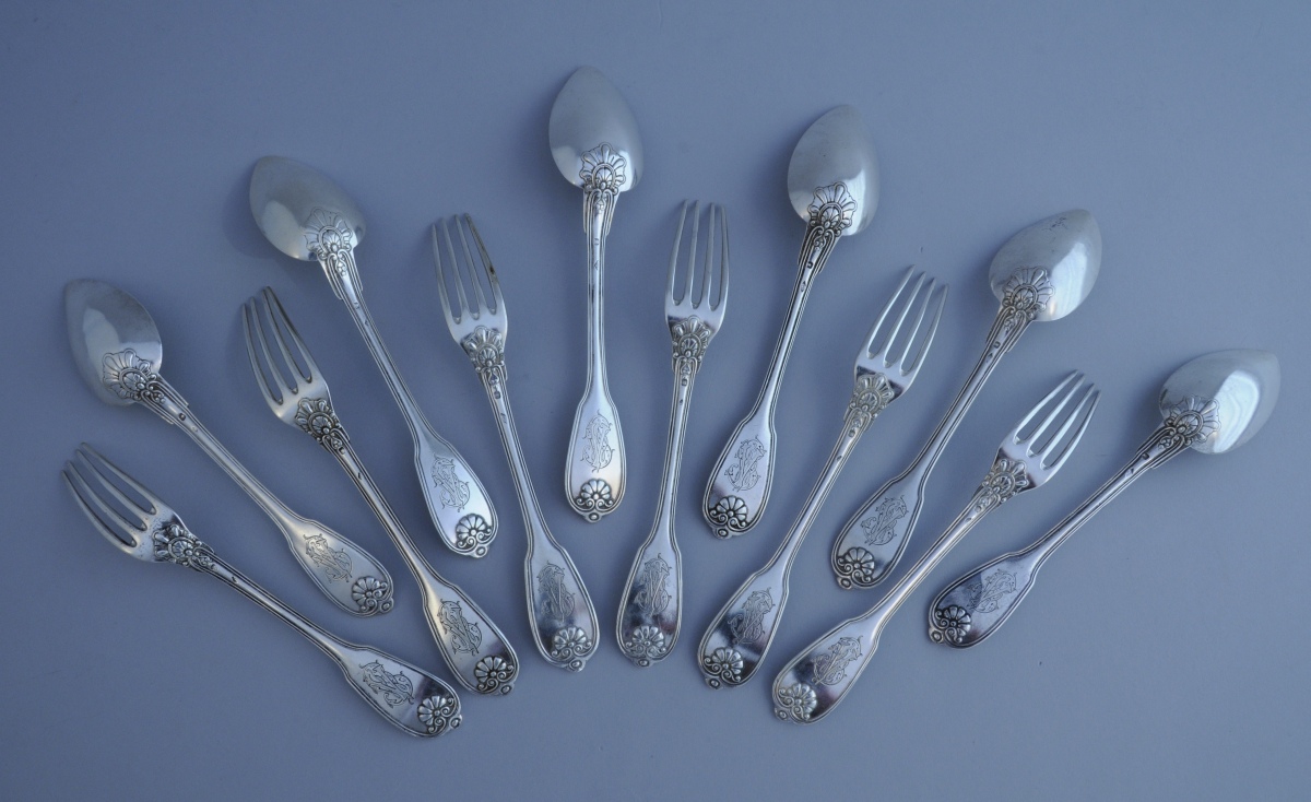 Série de 6 COUVERTS À ENTREMETS en argent. Modèle filet-coquille. Monogramme "V?".