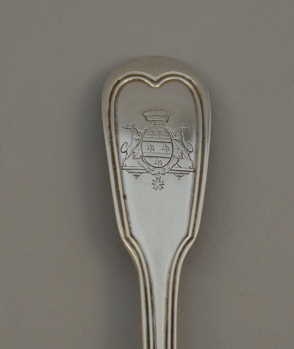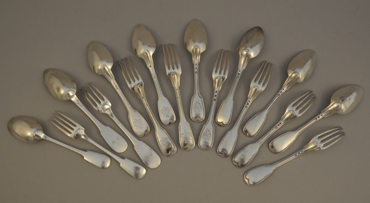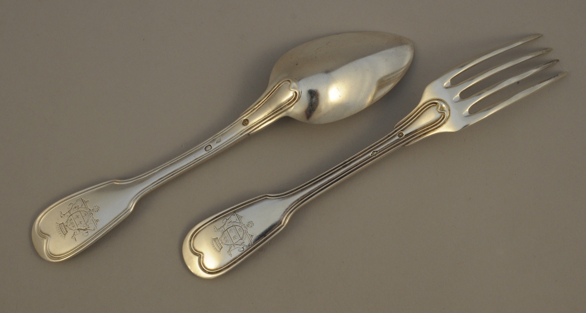 -Série de 2 couverts de table, modèle filet-contour. La spatule gravée d'armoiries portant l'ordre de la légion d'honneur timbrées d'une couronne comtale et supportées par deux lévriers. Poinçon 2nd Coq (1809-1819) pour une cuillère, Vieillard (1819-1838) pour une autre et Minerve pour les deux fourchettes. Paris, première moitié du XIXème.