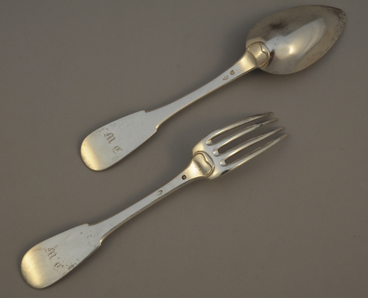 -2 couverts, modèle uniplat. Poinçon Minerve. L'un monogrammé "MC", l'autre par CHRISTOFLE. XIXème. Poids: 335 g.