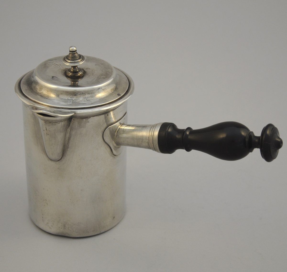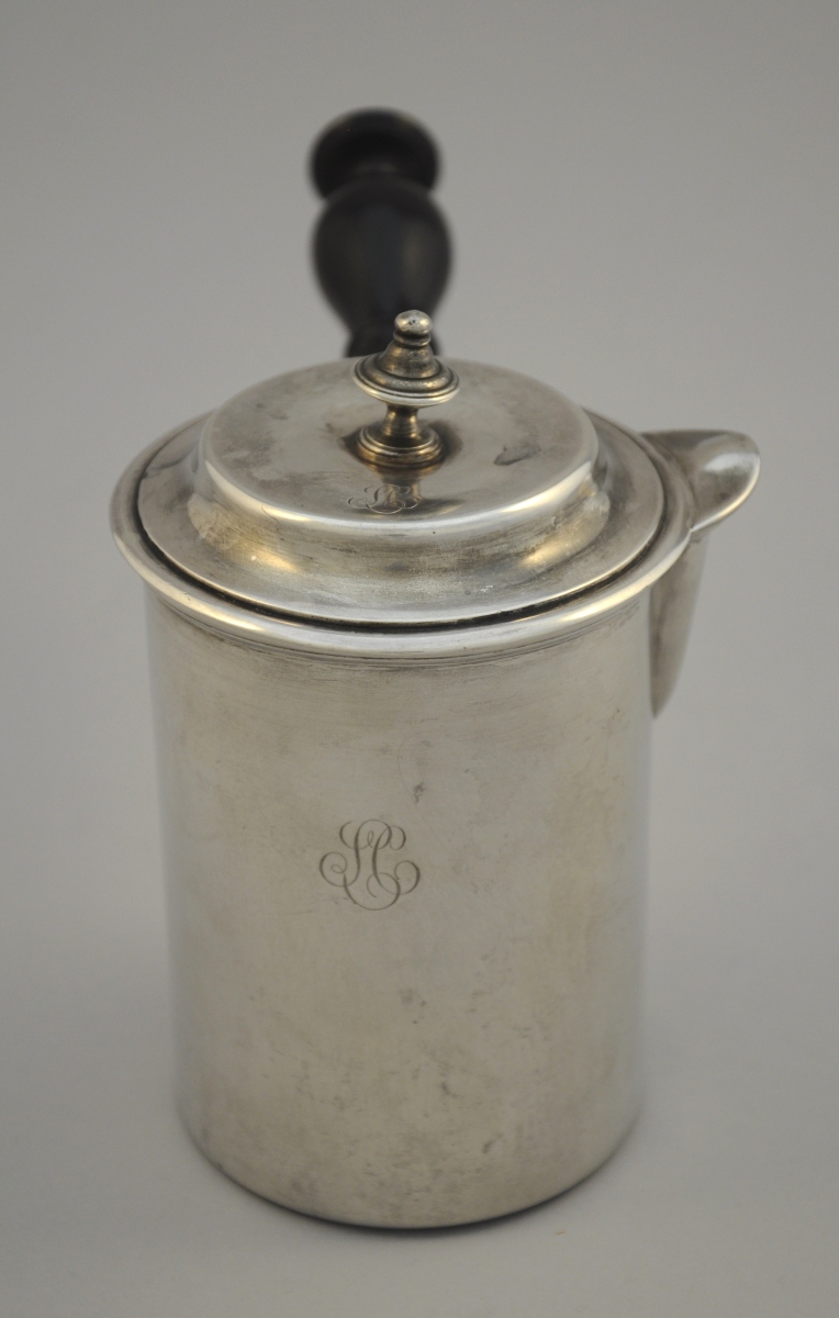 ODIOT. CAFETIÈRE de forme tubulaire en argent uni. Manche latéral en bois tourné et noirci. Le couvercle sommé d'un fretel toupie. Monogrammée "LC".