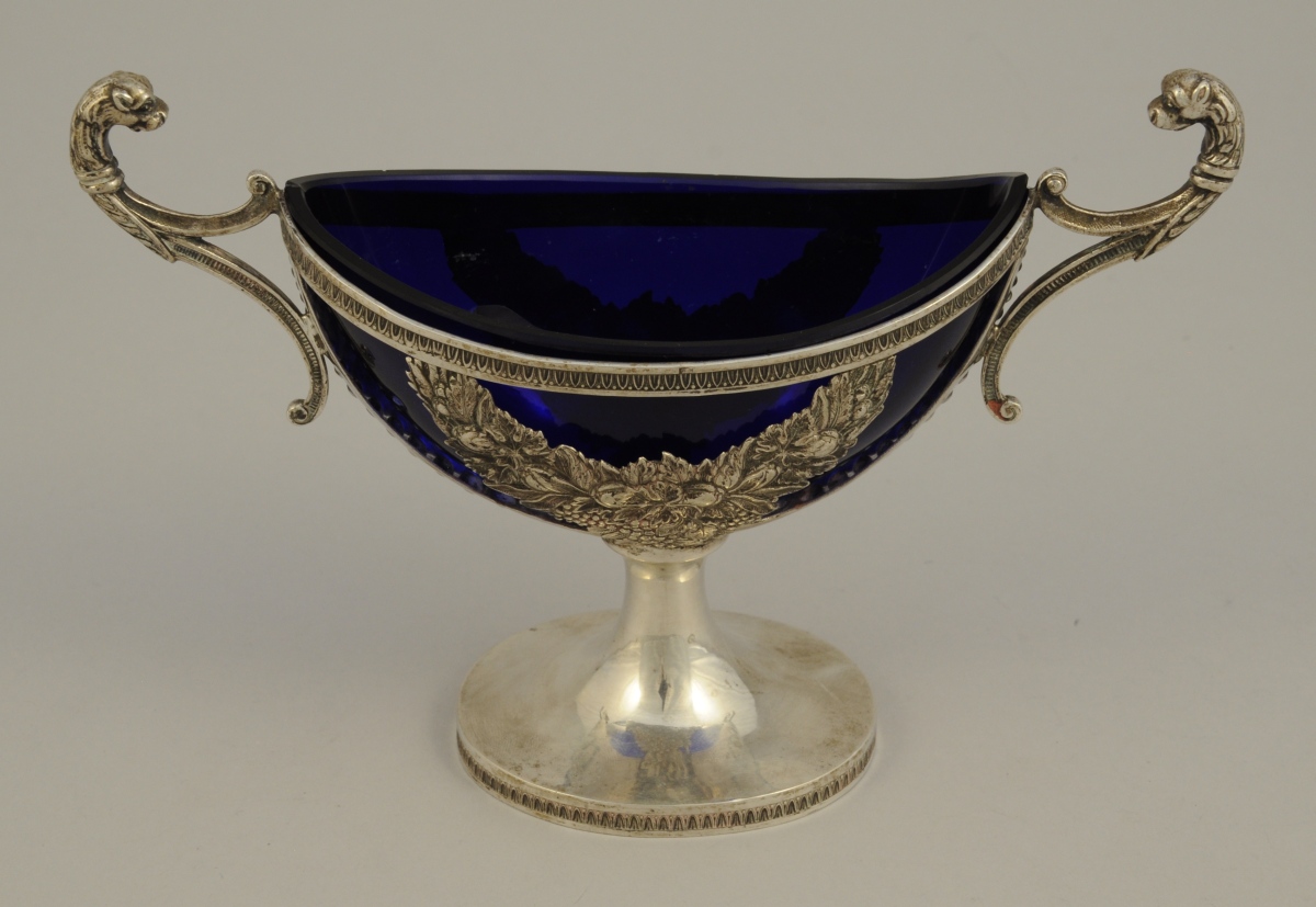 SUÈDE (?) SUCRIER de forme navette en argent. La panse ajourée d'une large guirlande de fruits. Anses latérale à tête de félin et enroulements. Repose sur un piédouche ciselé d'une frise de feuilles d'eau. Réceptacle en verre bleu (petites égrenures).