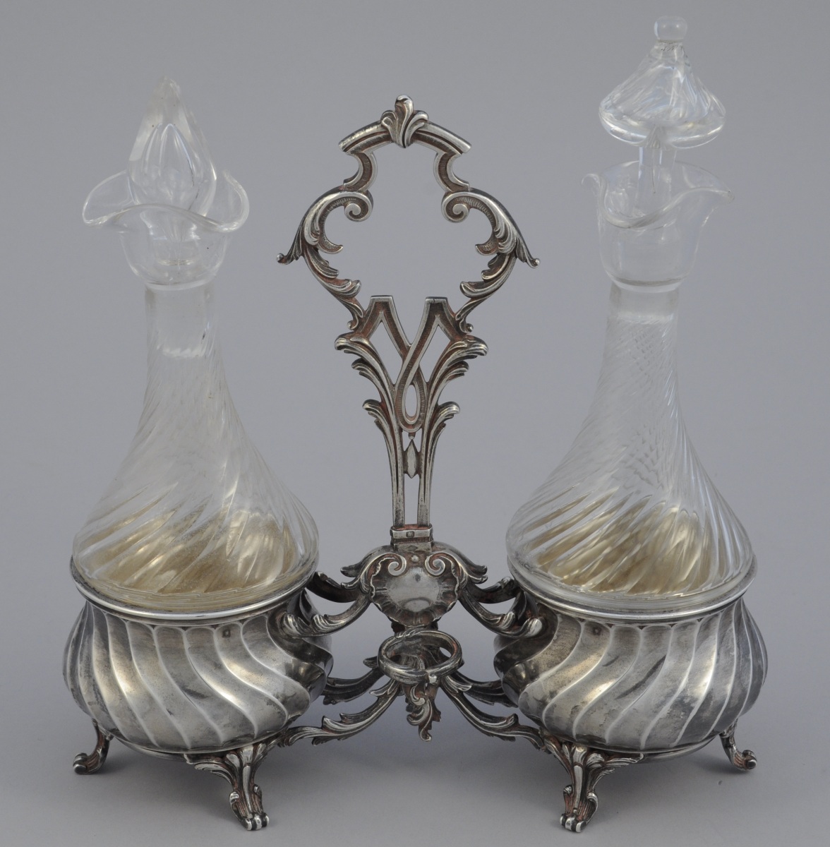 HUILIER-VINAIGRIER en argent, beau modèle de style XVIIIème. Réceptacle à godrons, piètement et anse, prise de main de feuillagés et coquille. Flacons en verre torsadé.