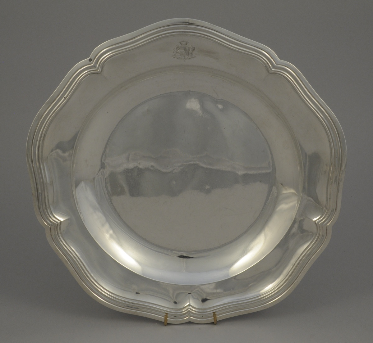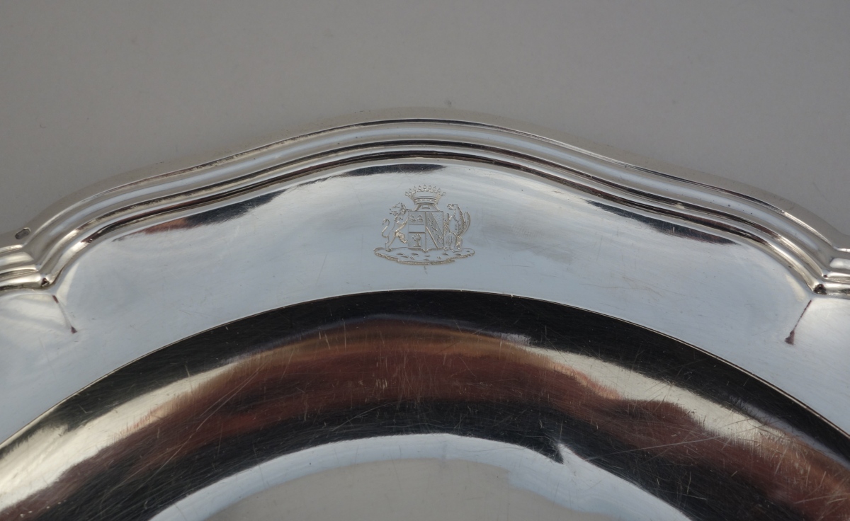 PLAT creux rond en argent, bordure à modèle filet-contour. Armes gravées timbrées d'une couronne comtale.
