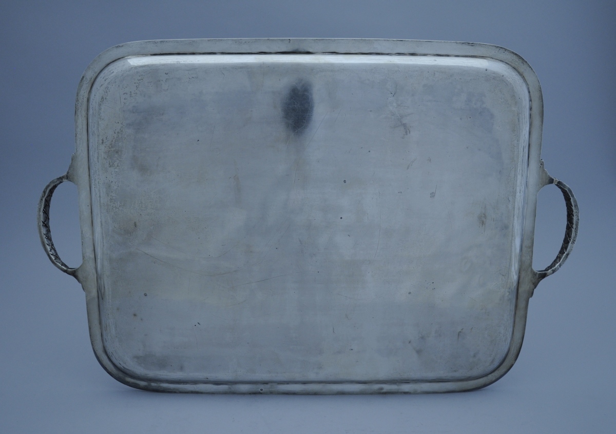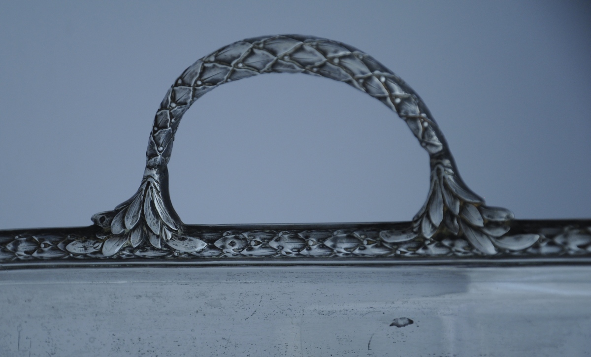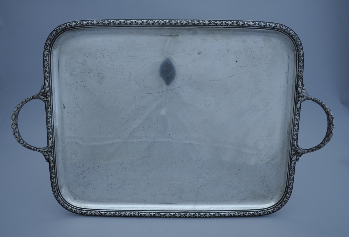 PLATEAU DE SERVICE de forme rectangulaire en argent. La bordure à décor d'une frise de lauriers. Anses latérale à attaches feuillagées.