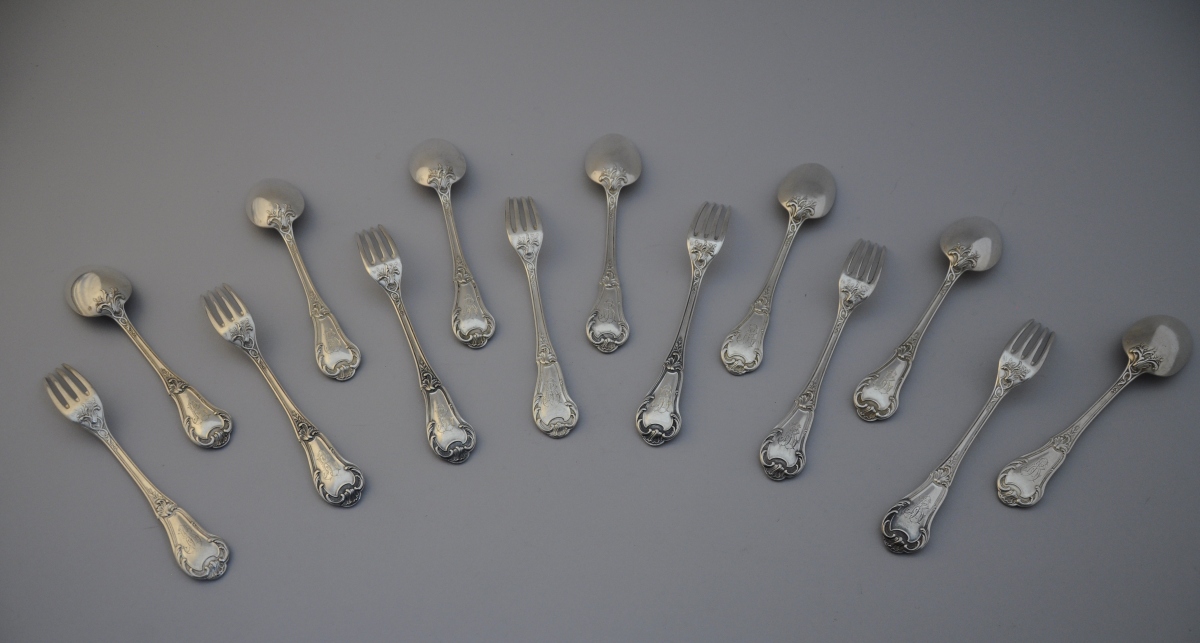 7 COUVERTS en argent, à bords festonnés, à motifs de feuillages en agrafe, monogrammés "BR".