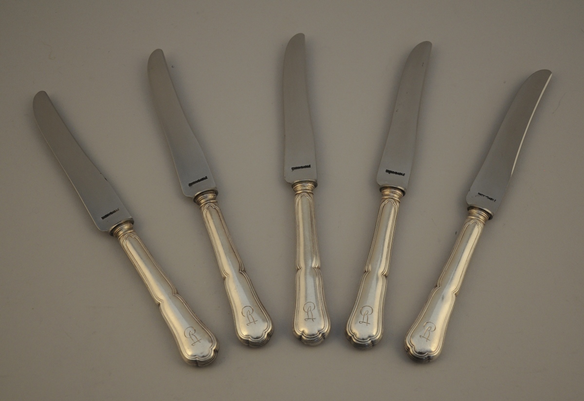 JOINT: 5 COUTEAUX, manche en argent fourré, lame inox.