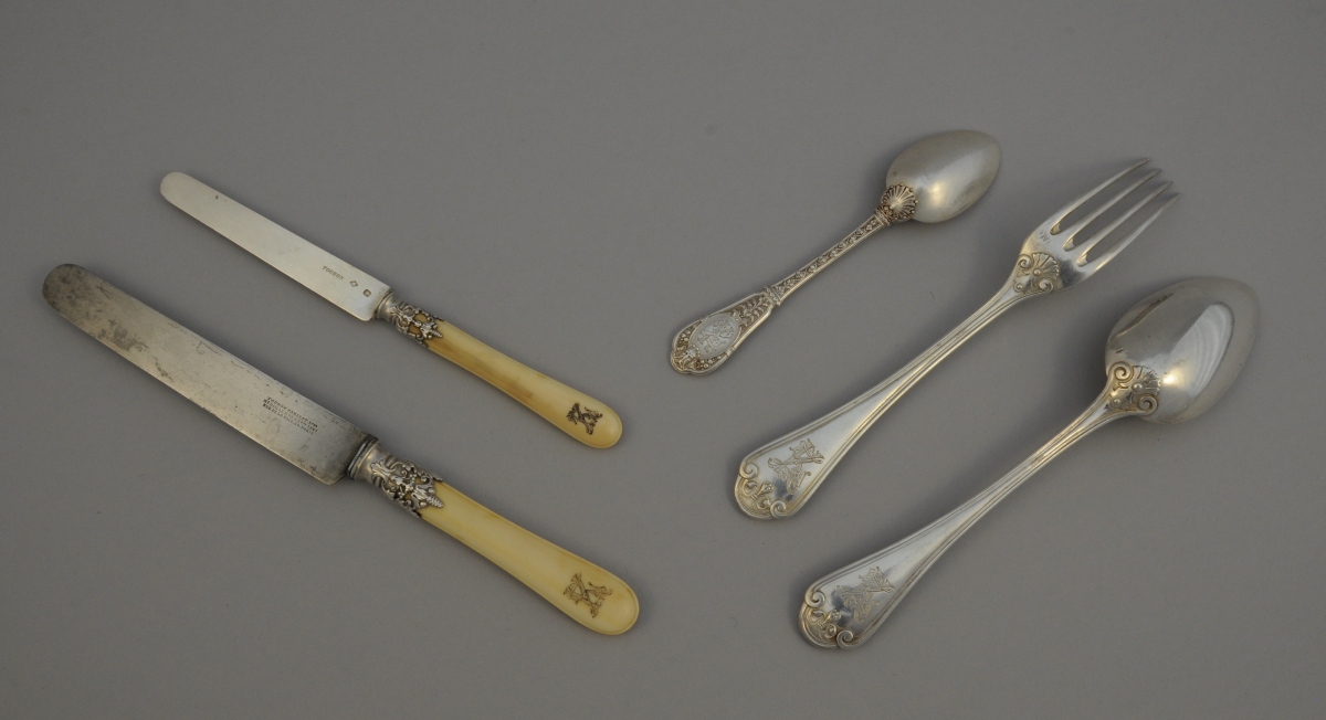 MÉNAGÈRE en argent de 72 pièces monogrammées "ZK" comprenant: 12 couverts, fourchettes et cuillières, modèle à double filets, coquille à l'amorti de la spatule, enroulement et feuille ; 12 petites cuillères en argent, le manche finement ciselé de feuilles de vignes, coquille à l'amortis de la spatule, tête de mascaron et guirlandes de fruits avec un écu, 12 grands et 12 petits couteaux à lame acier, manches en ivoire corolles à lambrequins d'argent, 12 couteaux à fruits, lame en argent, manche en ivoire corolles à lambrequin d'argent. Dans un écrin.