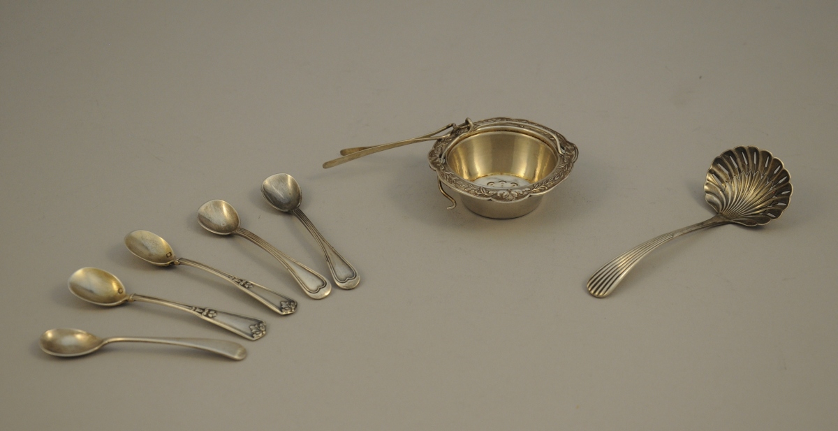 JOINT: 4 PIÈCES EN MÉTAL ARGENTÉ: cuillère saupoudreuse, le manche cannelé, le cuilleron coquille ajouré; paire de pelles à sel, modèle filet-contour; pelle à sel, modèle uniplat.