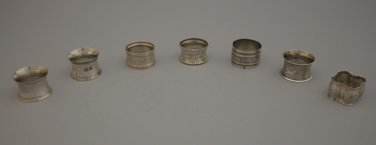 7 RONDS de SERVIETTE en argent. Décor de guillochis, feuilles d'acanthes, frise de palmettes, rubans, monogrammes...