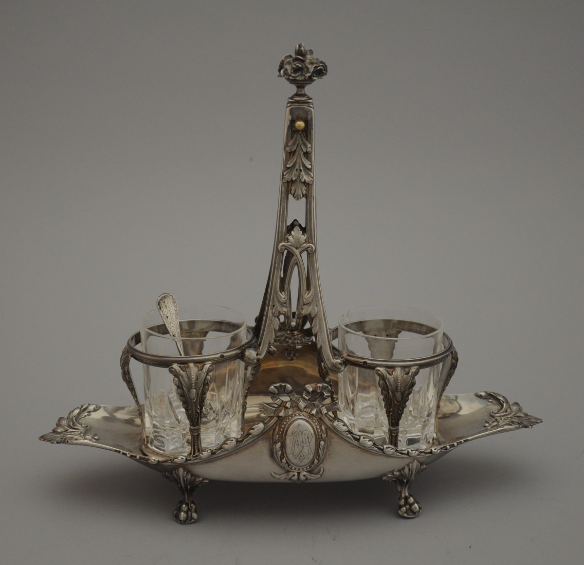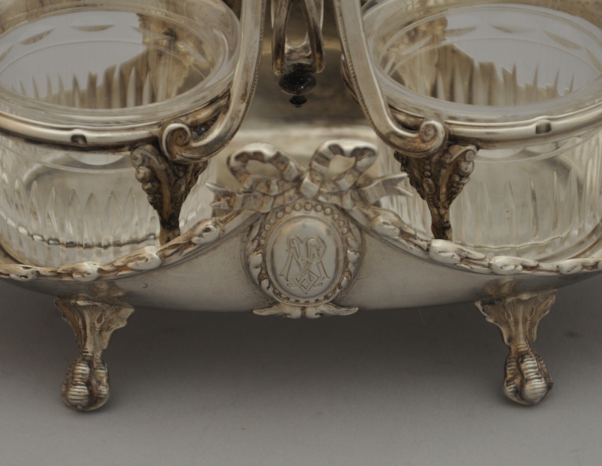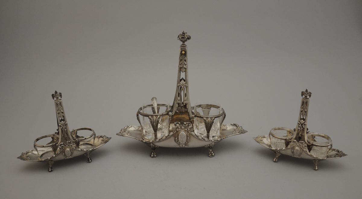 HUILIER-VINAIGRIER et paire de SALIÈRES en argent. La tige ajourée ornée de feuilles d'acanthes et surmontée d'un vase avec bouquet. Le socle en forme de feuille à décors d'acanthes, rubans, frises feuillagées. Écusson Monogrammé "P.M.". Reposant sur quatre pieds à attaches feuillagées, en forme de griffes de lion pour l'huilier vinaigrier et de griffes d'aigle pour les salières.