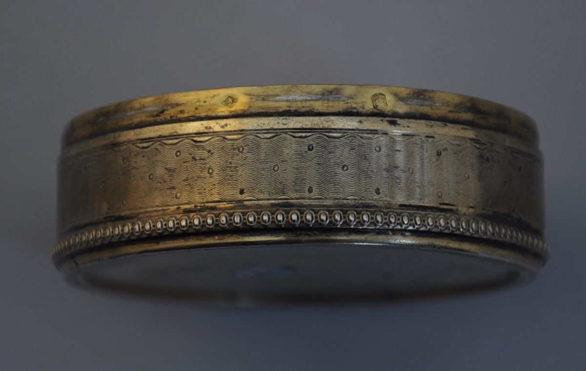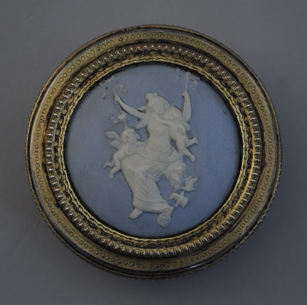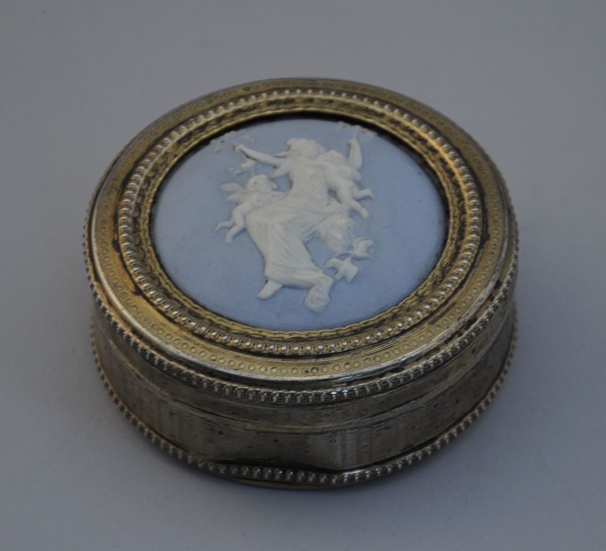 BOÎTE de forme circulaire en vermeil à décor de frises de piastres et de vagues, portant une plaque en biscuit dans le goût de Wedgwood figurant une allégorie de l'Amour à la balançoire.