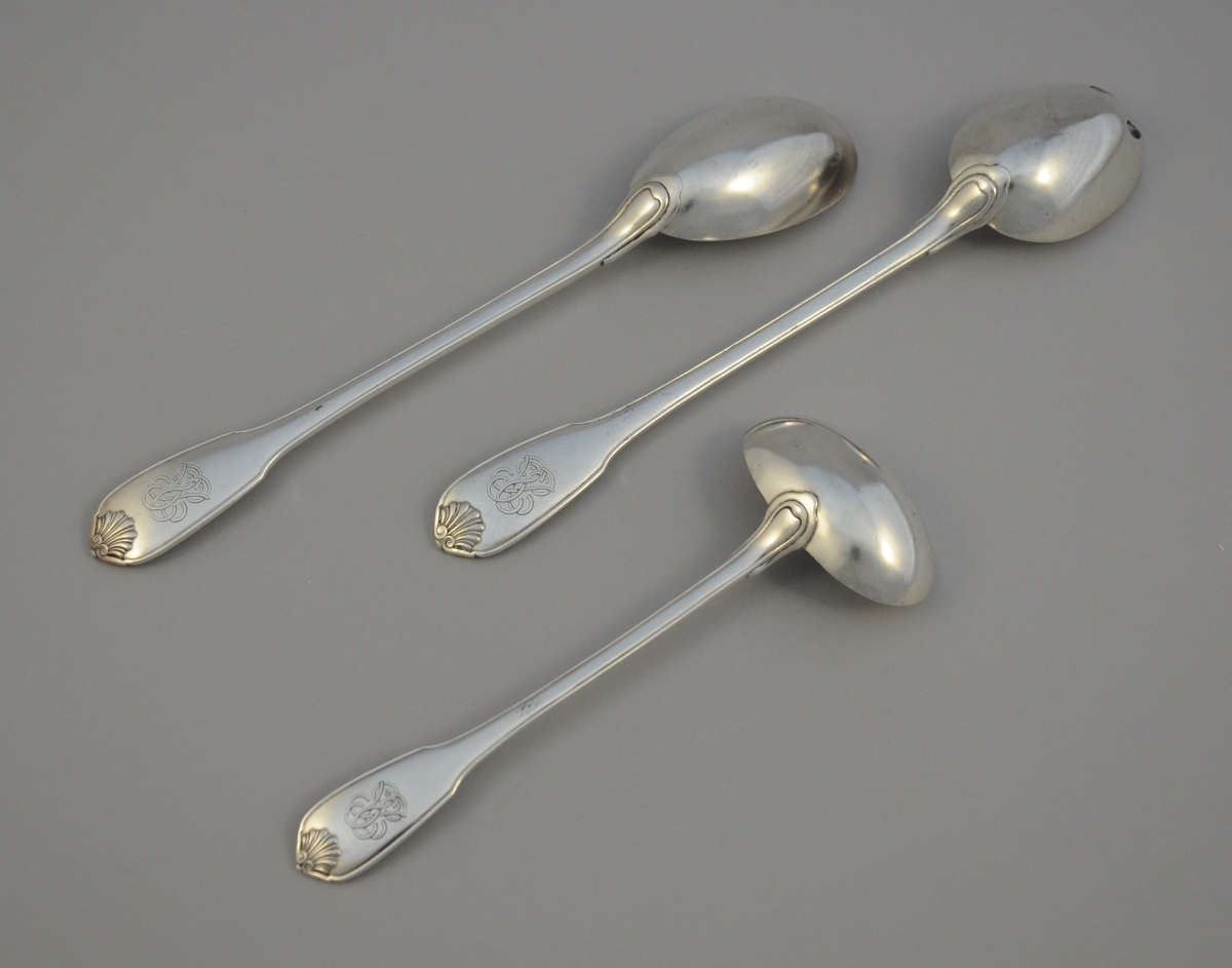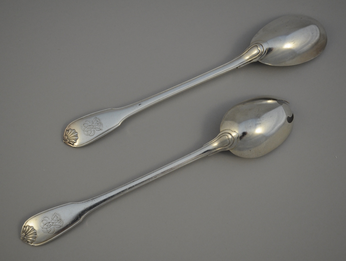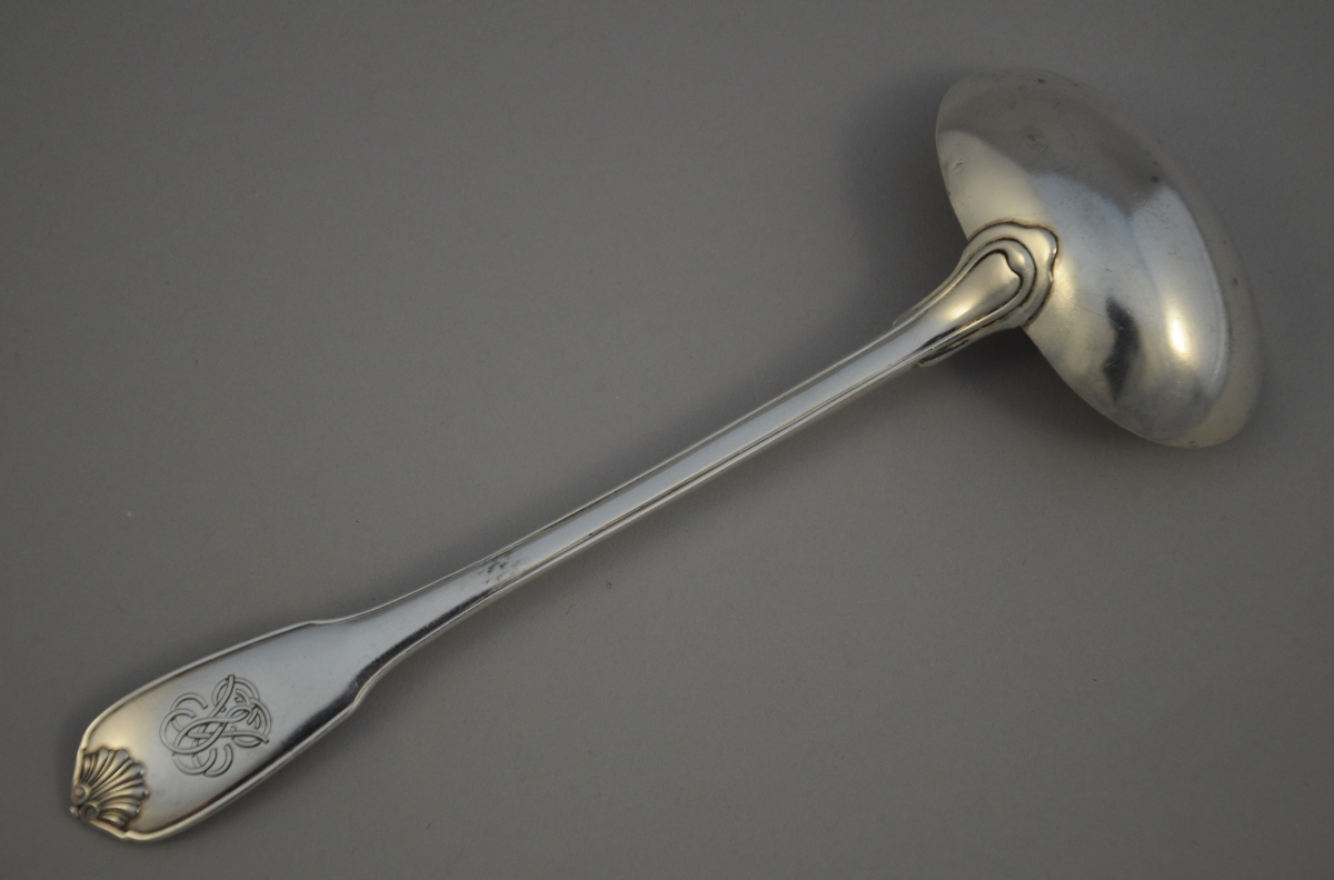 PUIFORCAT. COUVERT DE SERVICE À SALADE et CUILLÈRE À SAUCE, modèle filet-coquille. Spatule monogrammée.