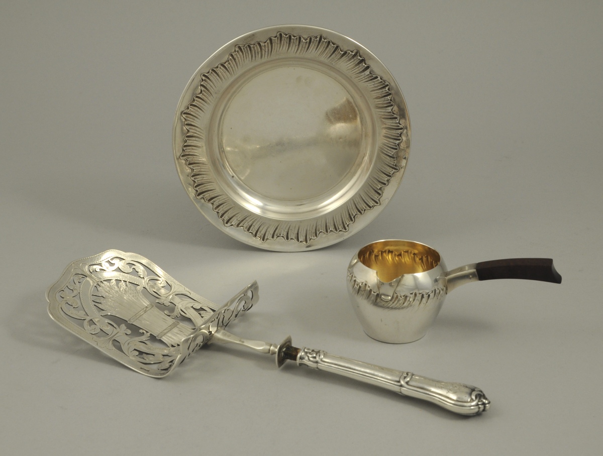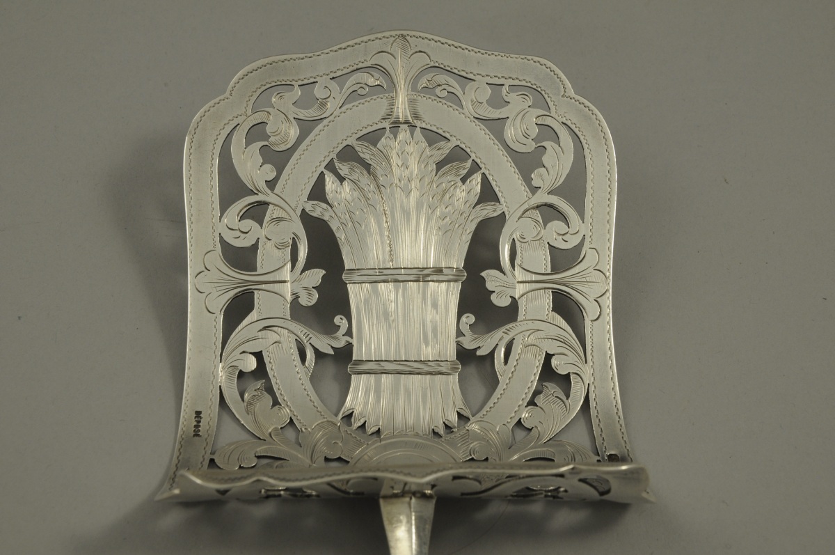 -PELLE à asperges. Manche en argent fourré au noeud gordien. La pelle ajourée de rinceaux et d'une botte d'asperges. Poids brut: 160 g. (manche disjoint)