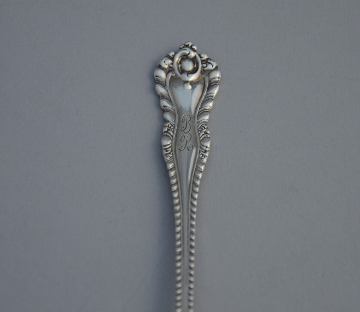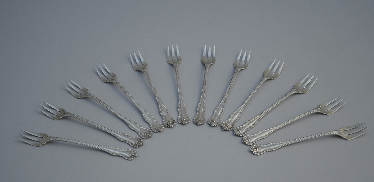 12 FOURCHETTES à dessert en argent. Spatule de forme violonnée à cartouche et frise de godrons. Monogrammées "B.R.".