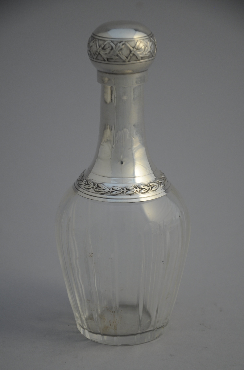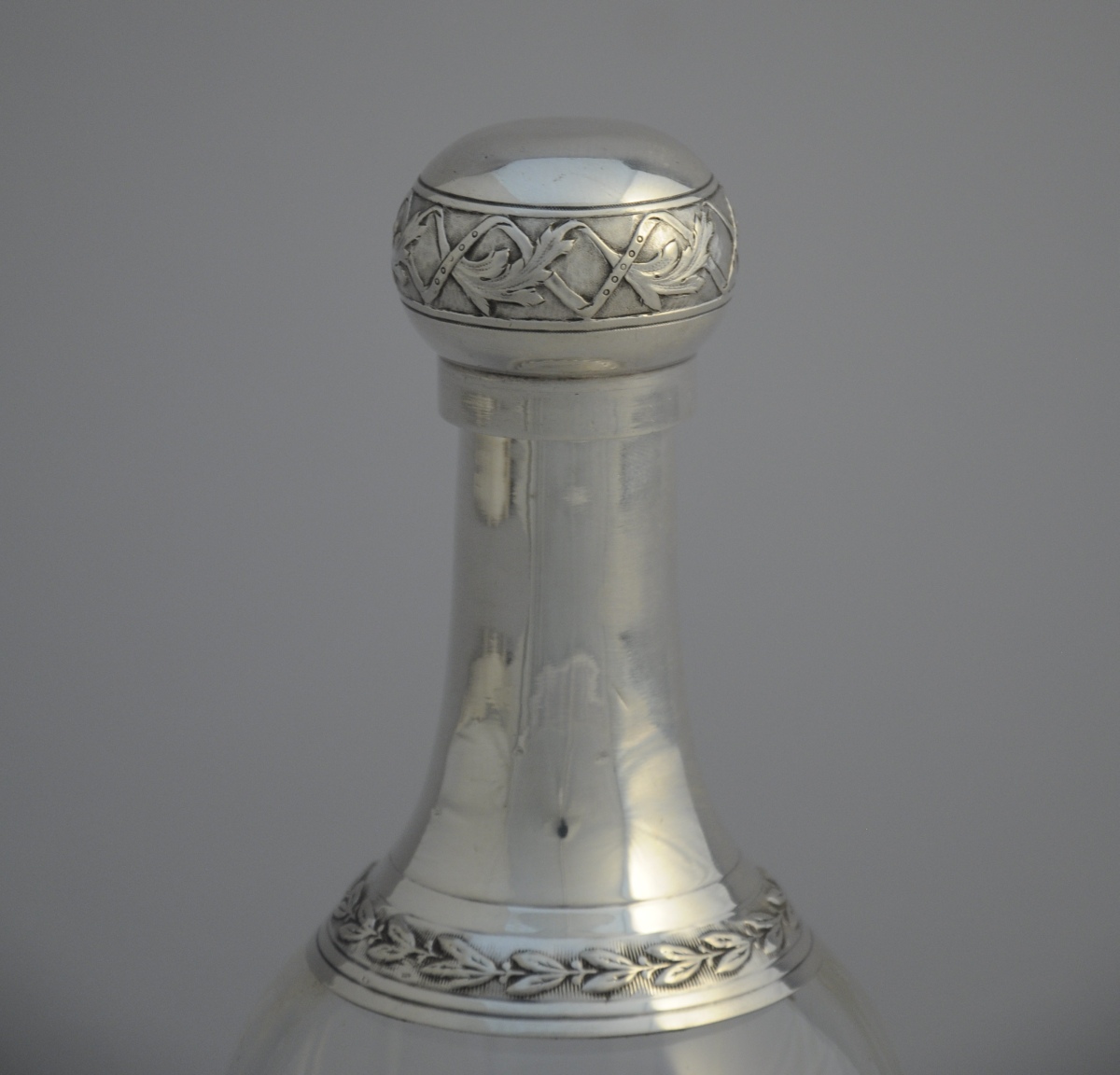 CARAFE à liqueur en cristal, monture en argent à guirlande de lauriers et bouchon à feuilles d'acanthe stylisées.