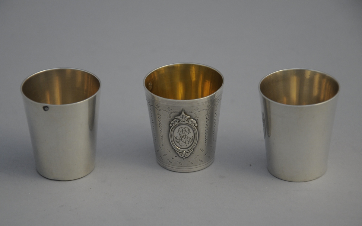 JOINT: 3 GOBELETS à liqueur en argent ornés d'écus pour 2 et d'un médaillon pour l'autre.