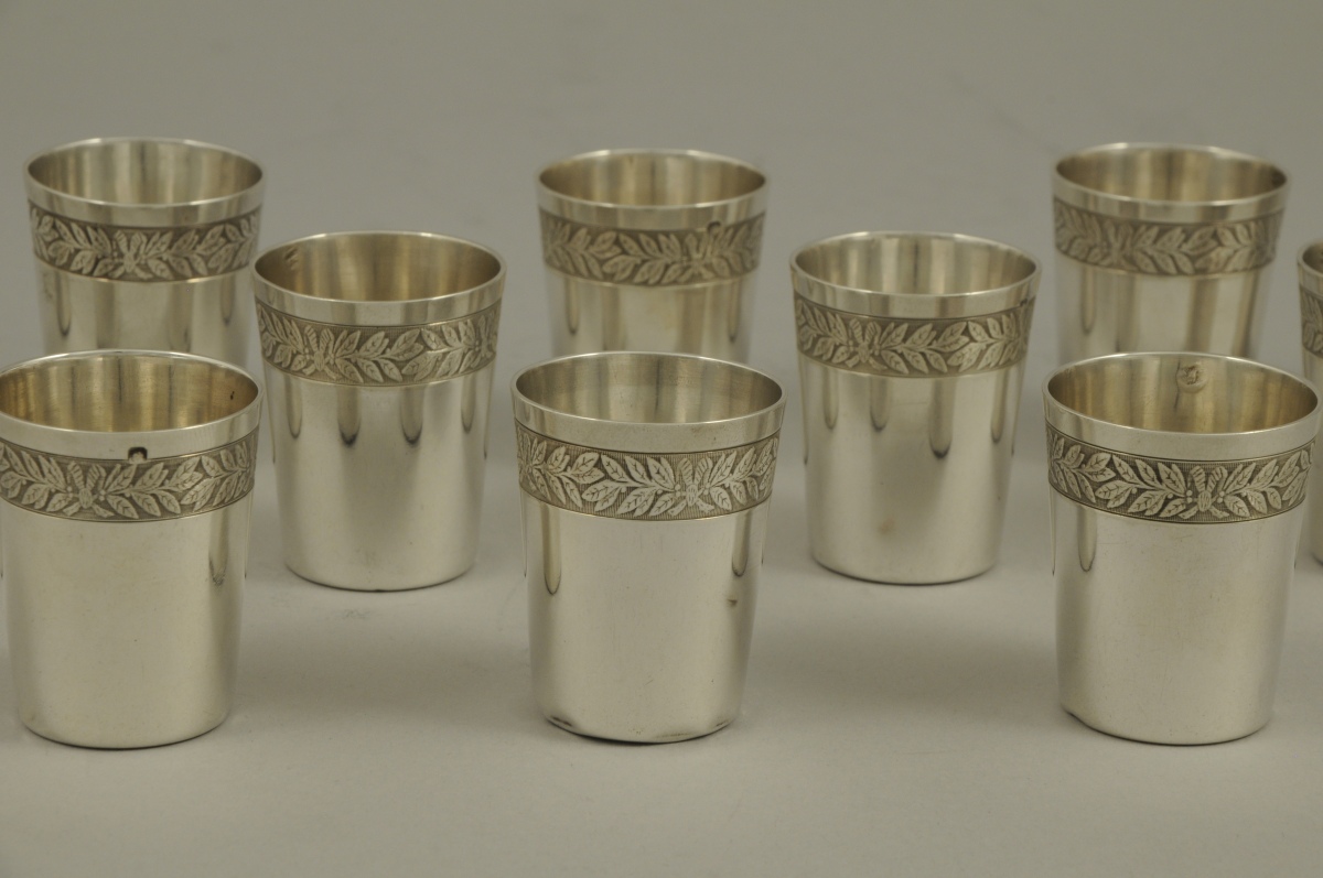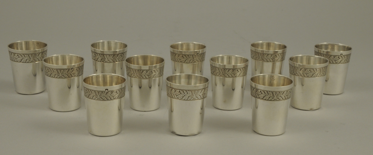 12 GOBELETS à liqueur en argent à frise de lauriers.