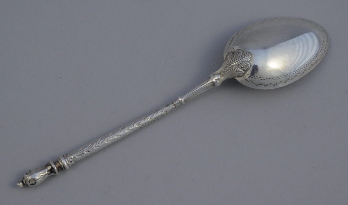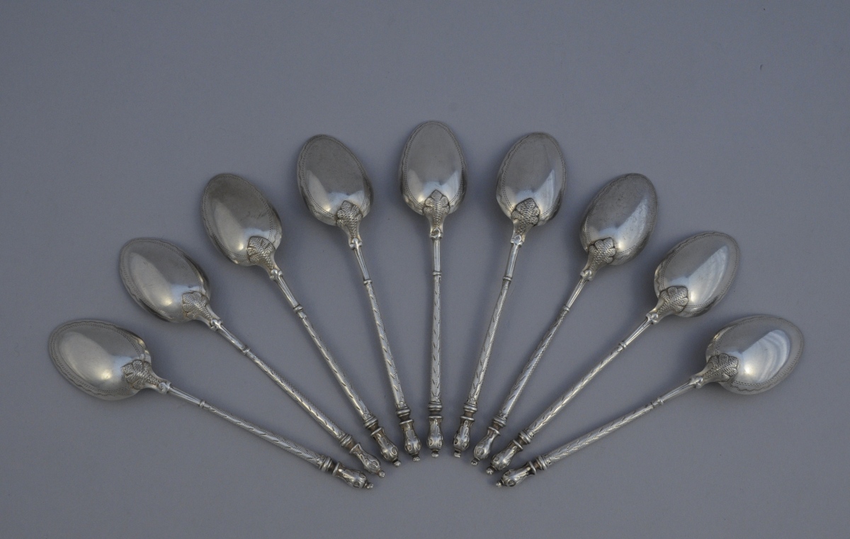9 CUILLIÈRES À CAFÉ en argent, manche "à la russe" à décor de guillochis.