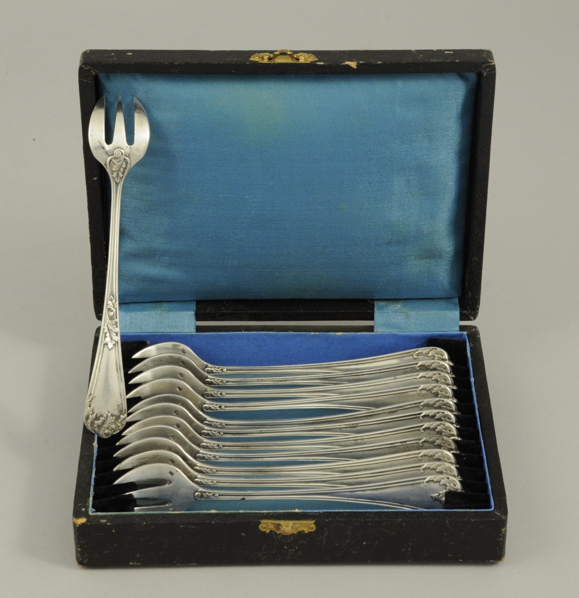 JOINT: 12 FOURCHETTES À HUÎTRES en métal argenté. Modèle à filet orné de rinceaux feuillagés et de feuilles d'acanthe. Dans un écrin. XXème.