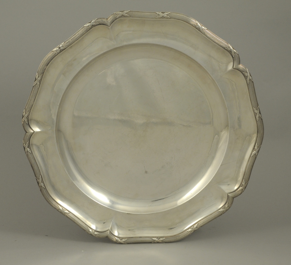 PLAT de forme ronde en argent. Bords chantournés ornés de joncs rubannés.
