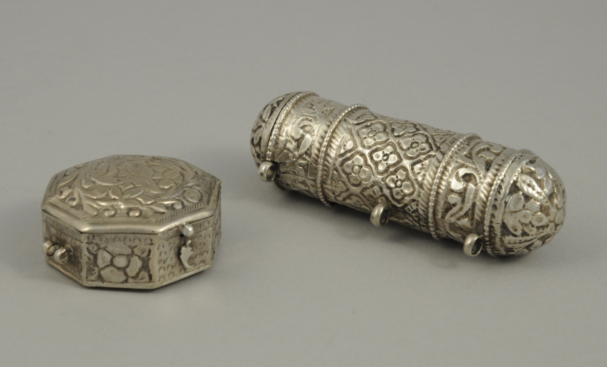 ORIENT. 2 BOÎTES en argent: une octogonale à lambrequins et oiseaux, l'autre en forme de navette à semi de fleurettes et lambrequins.