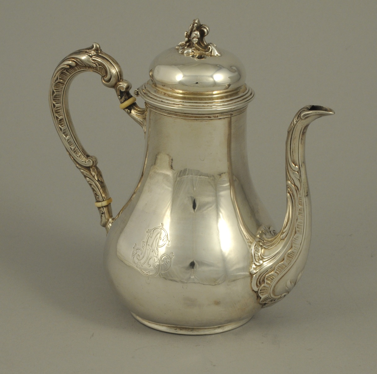 CAFETIÈRE ÉGOÏSTE en argent de forme pansue ornée au bec et à l'anse de feuilles d'acanthe stylisées et de guirlandes feuillagées. Prise à coquille et fleurs stylisées. Monogrammée.