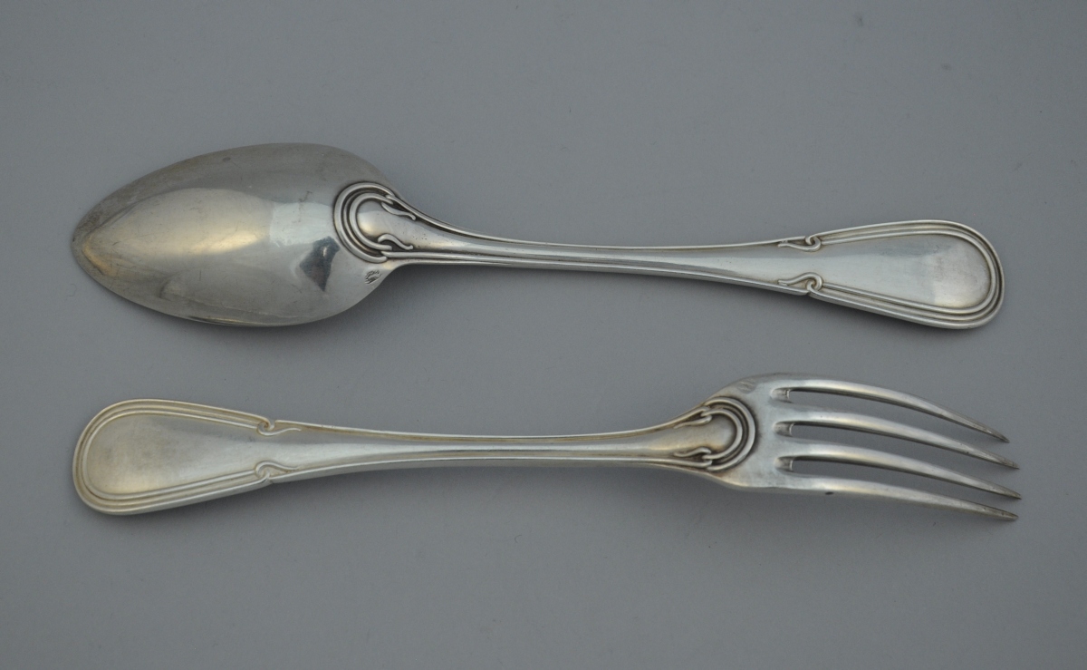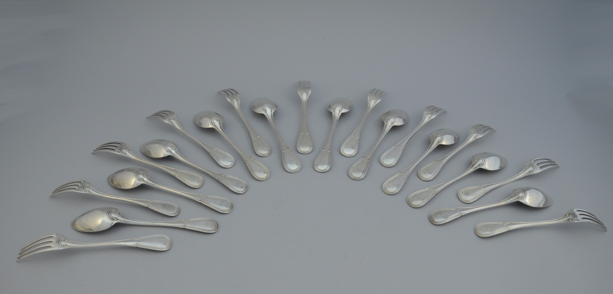 10 COUVERTS et 1 CUILLÈRE en argent. Modèle filet à agrafe.