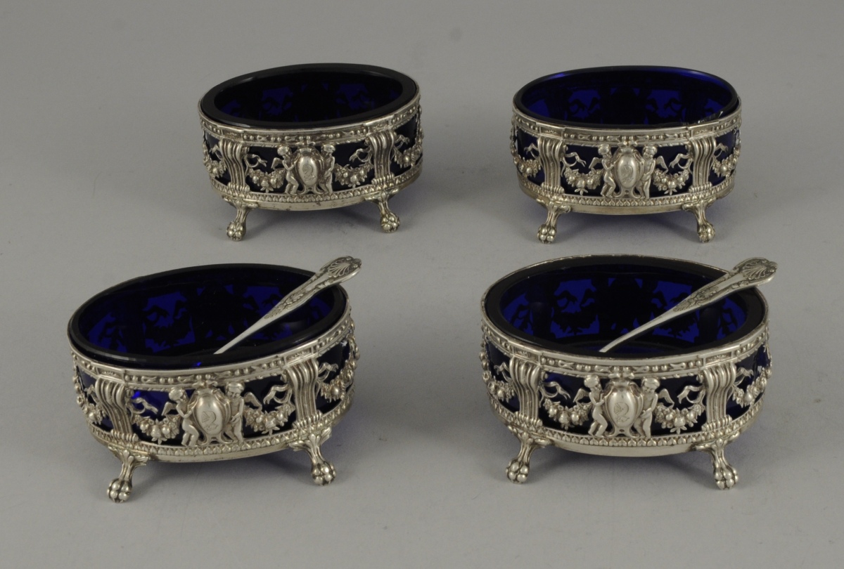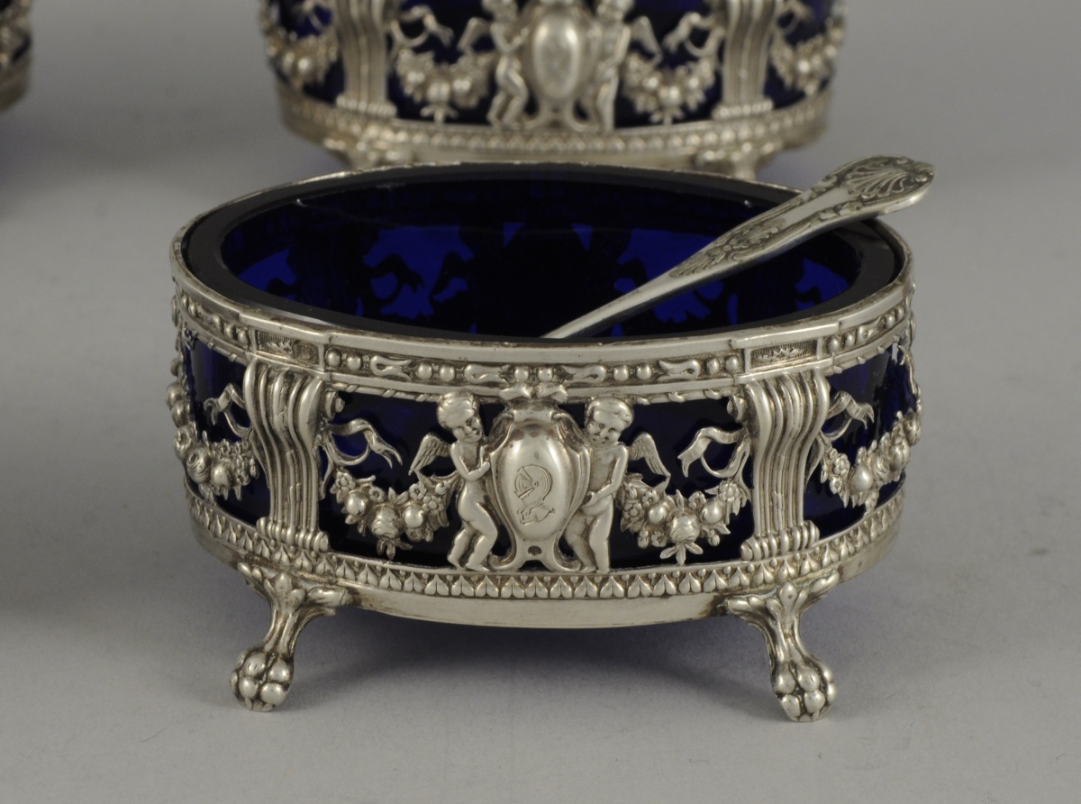 Suite de 4 SALERONS de forme ovale en argent à décor au repoussé d'angelots soutenant un écu gravé d'un heaume, guirlandes de fruits, rubans et consoles cannelées. Ils posent sur quatre pieds griffes. Intérieur en verre bleu.