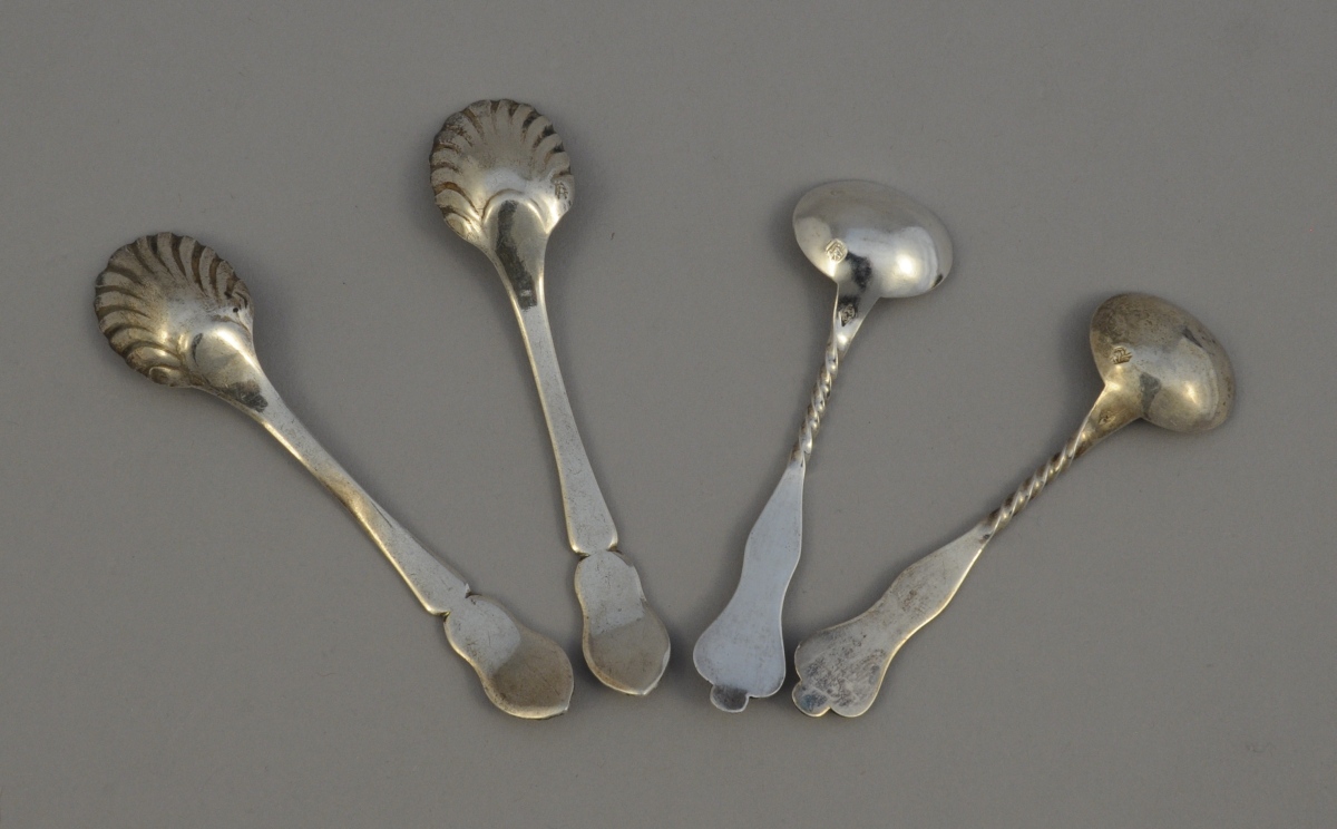 -La première à cuilleron coquille. Spatule violonnée ornée d'un mascaron, cartouche et enroulements. Poinçon Minerve. Style Renaissance, seconde moitié du XIXème. Poids: 15 g.