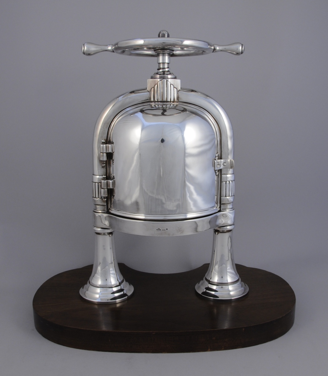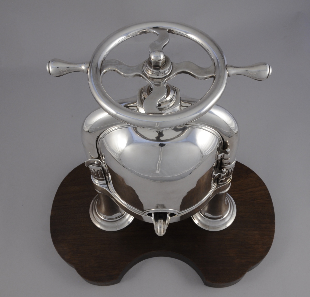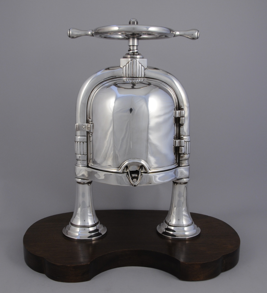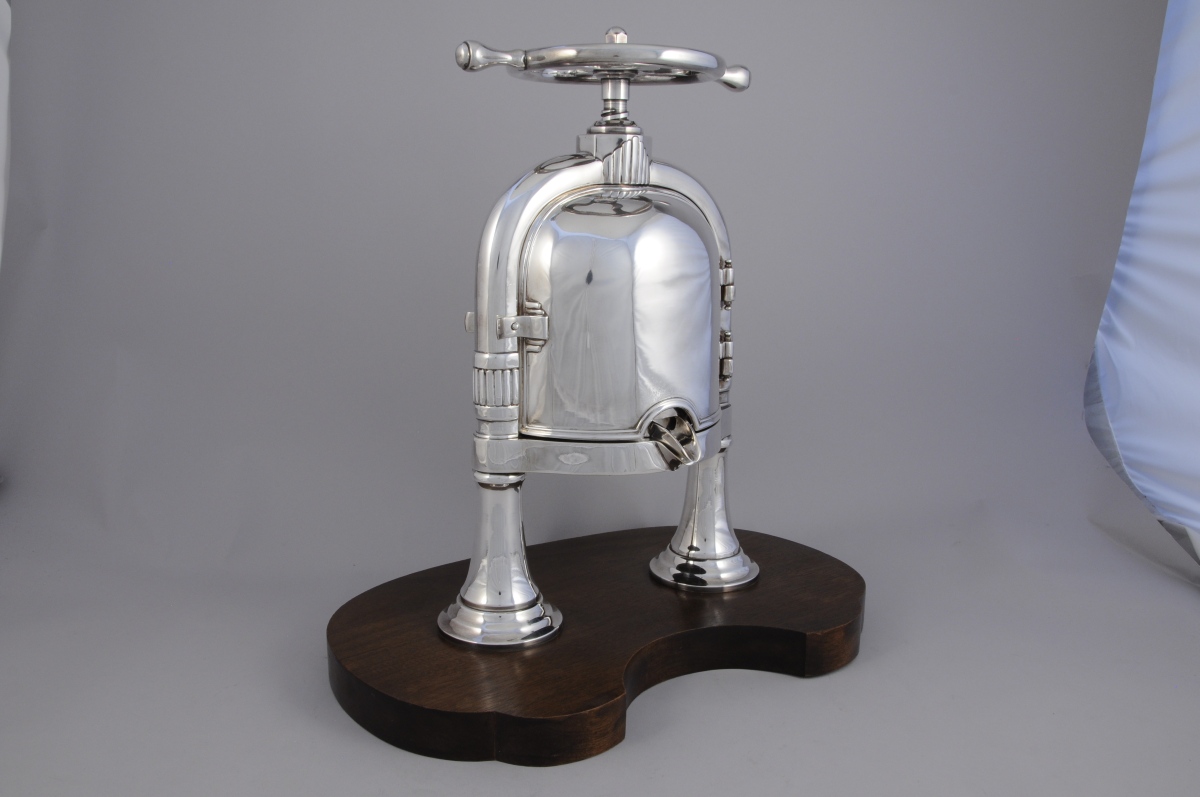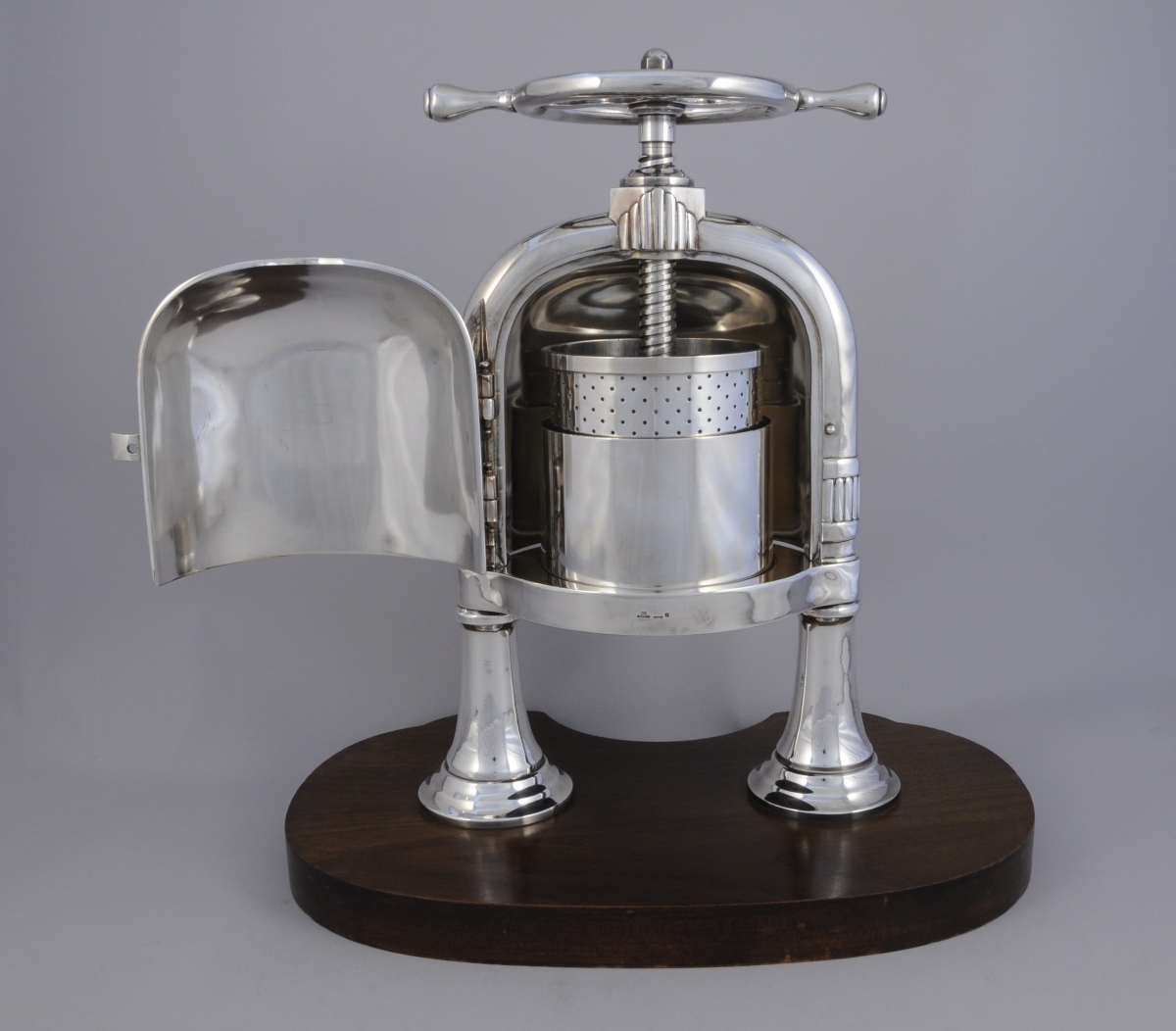Toujours proposée dans le catalogue de la maison Christofle, la presse à canard est une pièce de haute orfèvrerie, créée à la demande, nécessitant plus de 150 heures de travail. C'est un objet de qualité, typique d'hôtellerie pour réaliser le canard au sang, dont le restaurant " La Tour d'Argent " à Paris s'est fait une spécialité. Cette recette implique une sélection des canards avant abattage qui doivent être étouffés et non saignés pour garder leur sang. Une fois cuit, le volatile est découpé devant l'hôte, la carcasse, placée dans la presse, est toujours écrasée devant le convive. Sur socle en bois, la presse est actionnée par un volant qui fait tourner la vis écrasant la carcasse placée dans son réceptacle ajouré. Le jus s'écoule alors dans le récipient placé sous le bec. La porte frontale permet d'éviter les projections pendant l'écrasement.