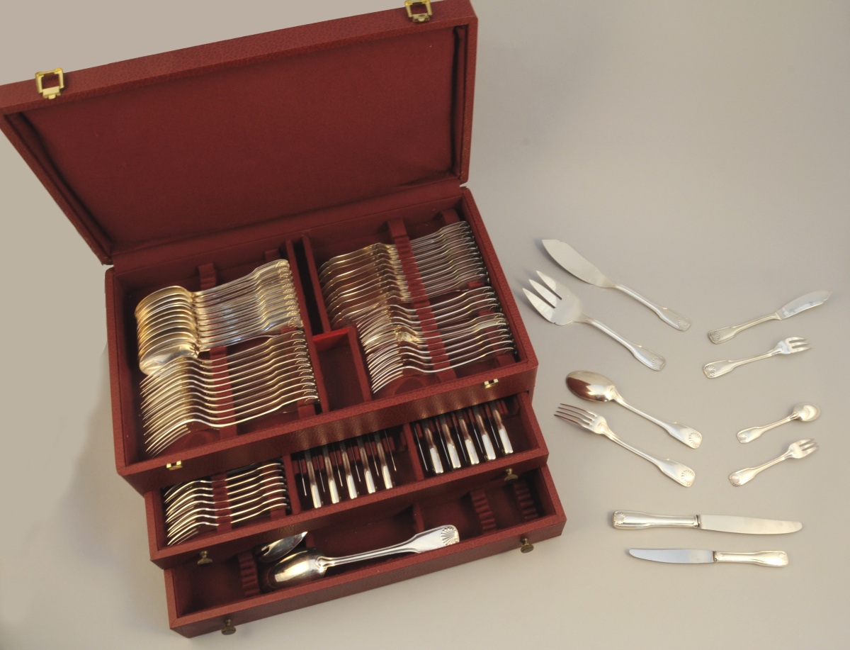 Modèle filet-coquille comprenant: 12 couverts de table, 12 cuillières de table, 12 couteaux à poisson, 12 couverts à entremets, 12 fourchettes à dessert, 12 cuillières à dessert, 1 louche, 1 couteau à fromage, 2 couverts de service à poisson, 1 cuillière à crème, 2 couverts de service à salade. Dans un coffret en bois et faux cuir.
