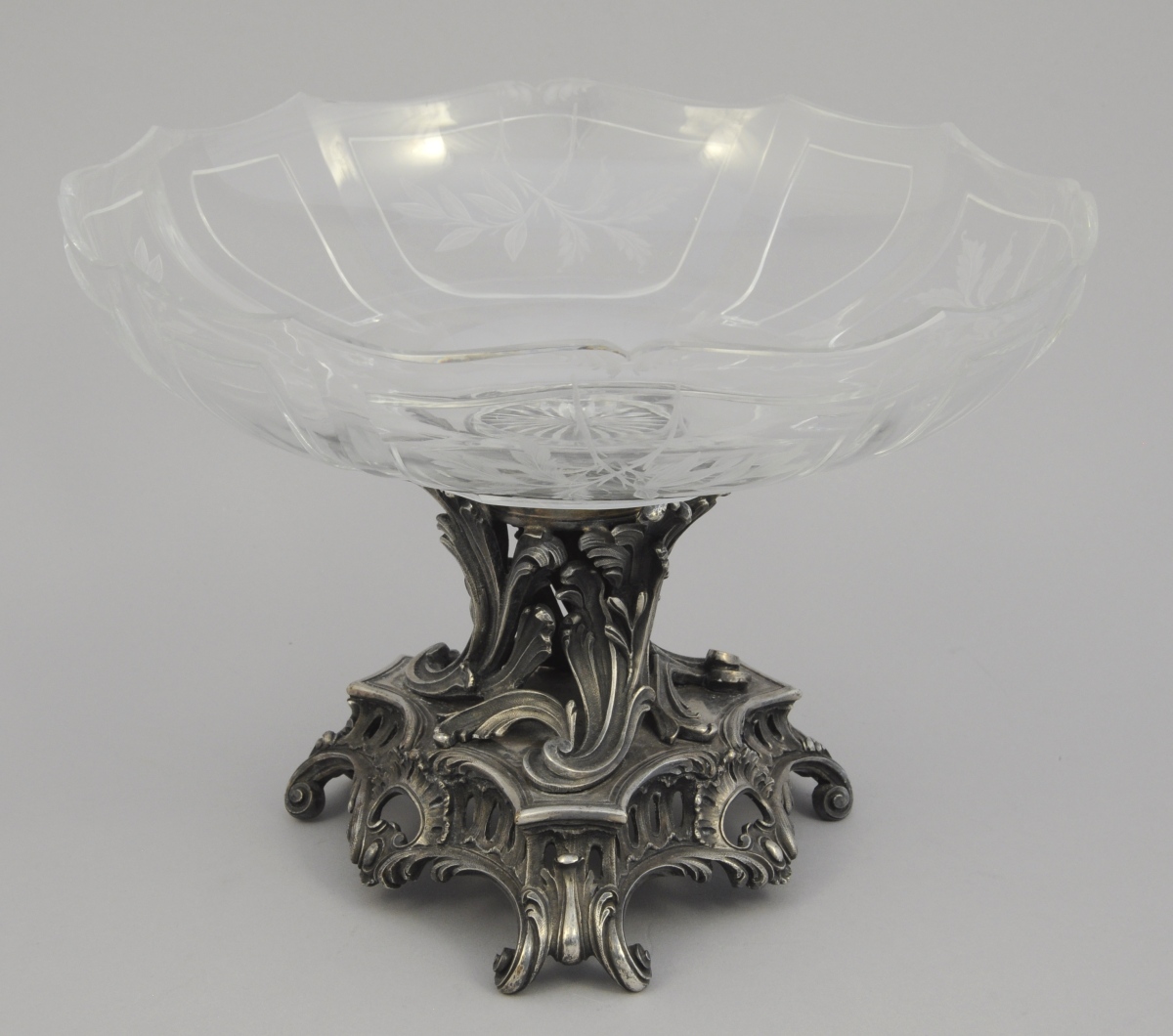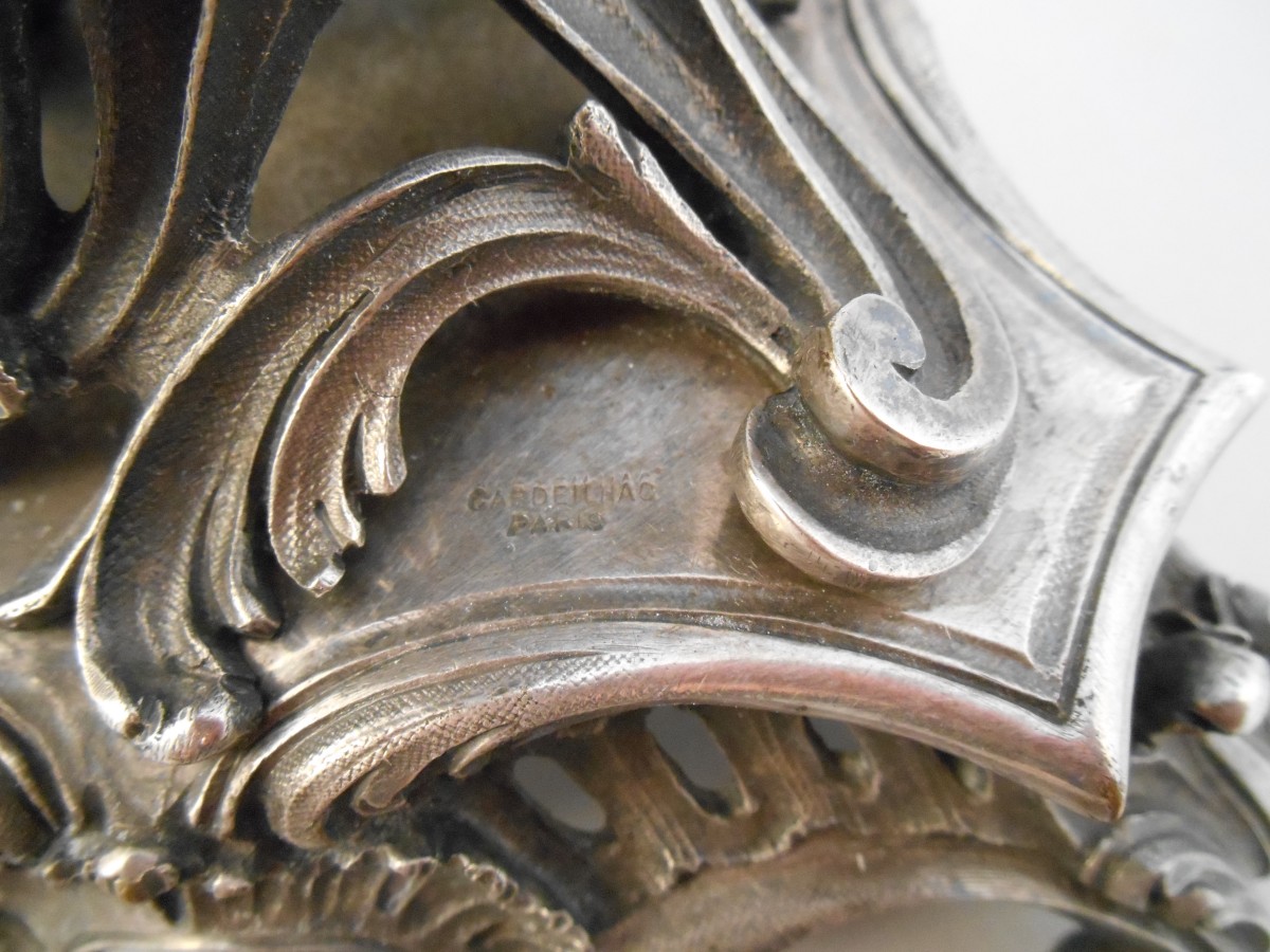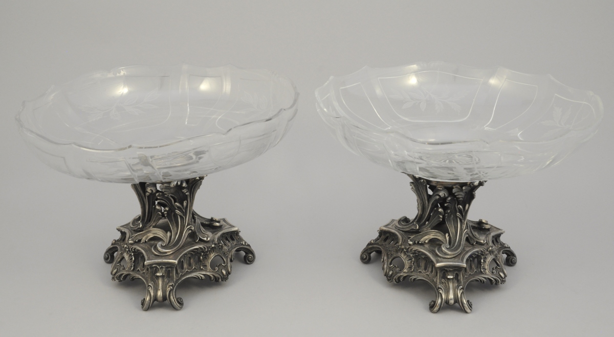 Paire de COUPES MONTÉES en cristal et bronze argenté. Monture ajourée à agrafes feuillagées et rocailles, signée CARDEILHAC. Coupe en cristal taillé à côtes, gravé de feuillages .