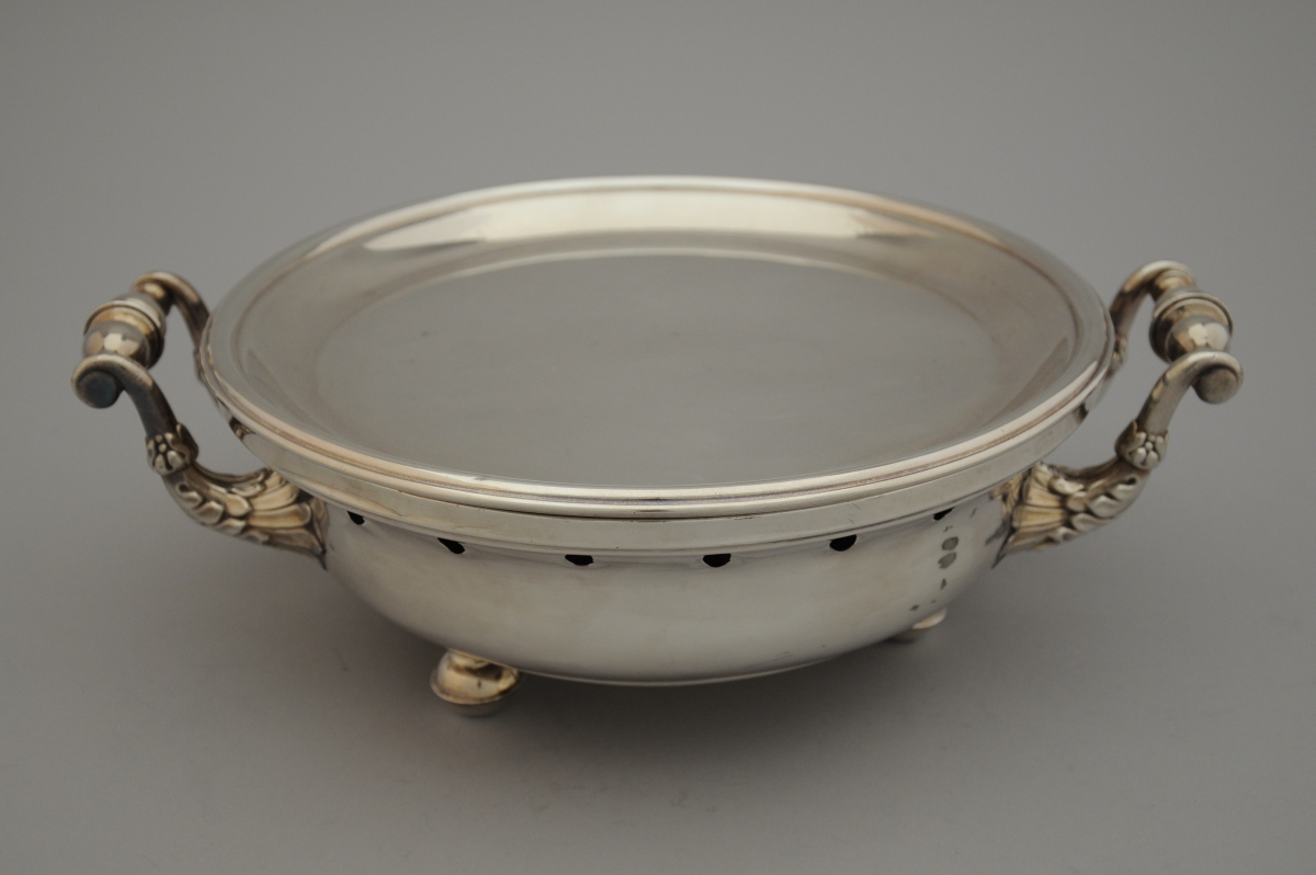 CHAUFFE-PLAT en métal argenté. Les anses à décor tourné, les attaches à motifs d'acanthes. Travail étranger.