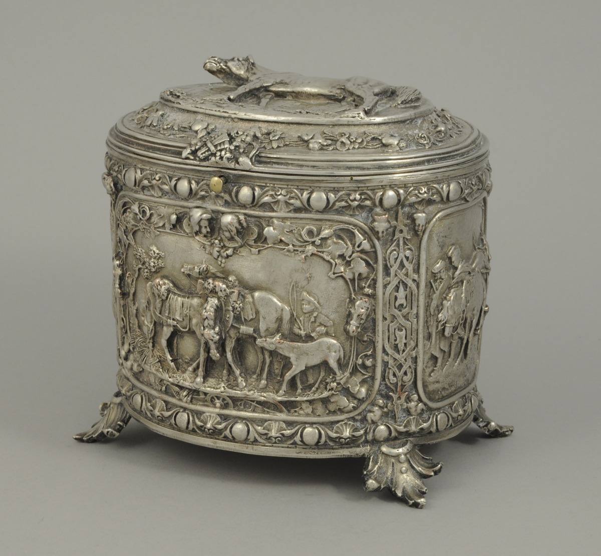 BOÎTE en métal argenté à décor équestre. Scènes de chevaux entourés d'arabesques, d'angelots, de frises d'oves et têtes en demi-relief.
