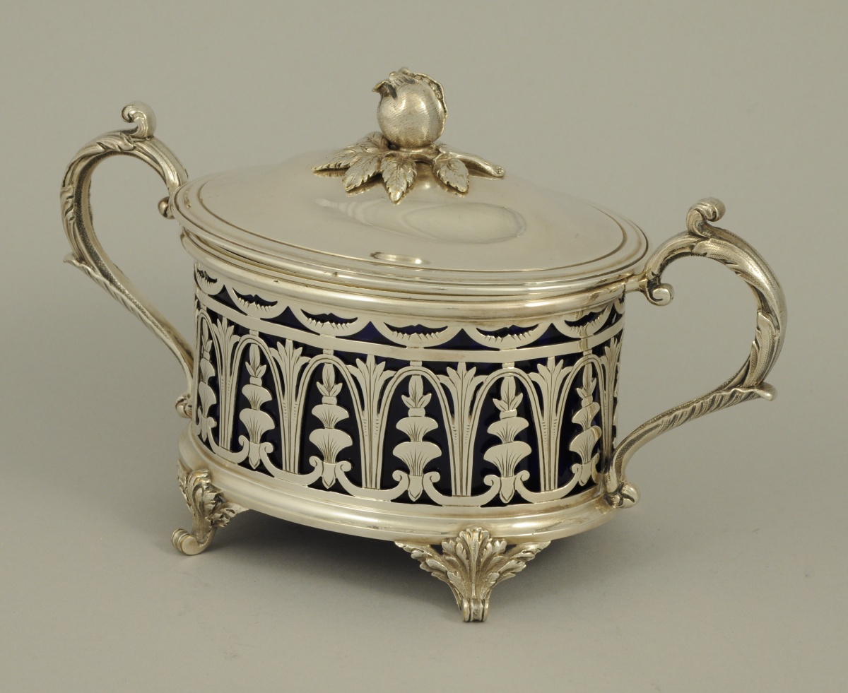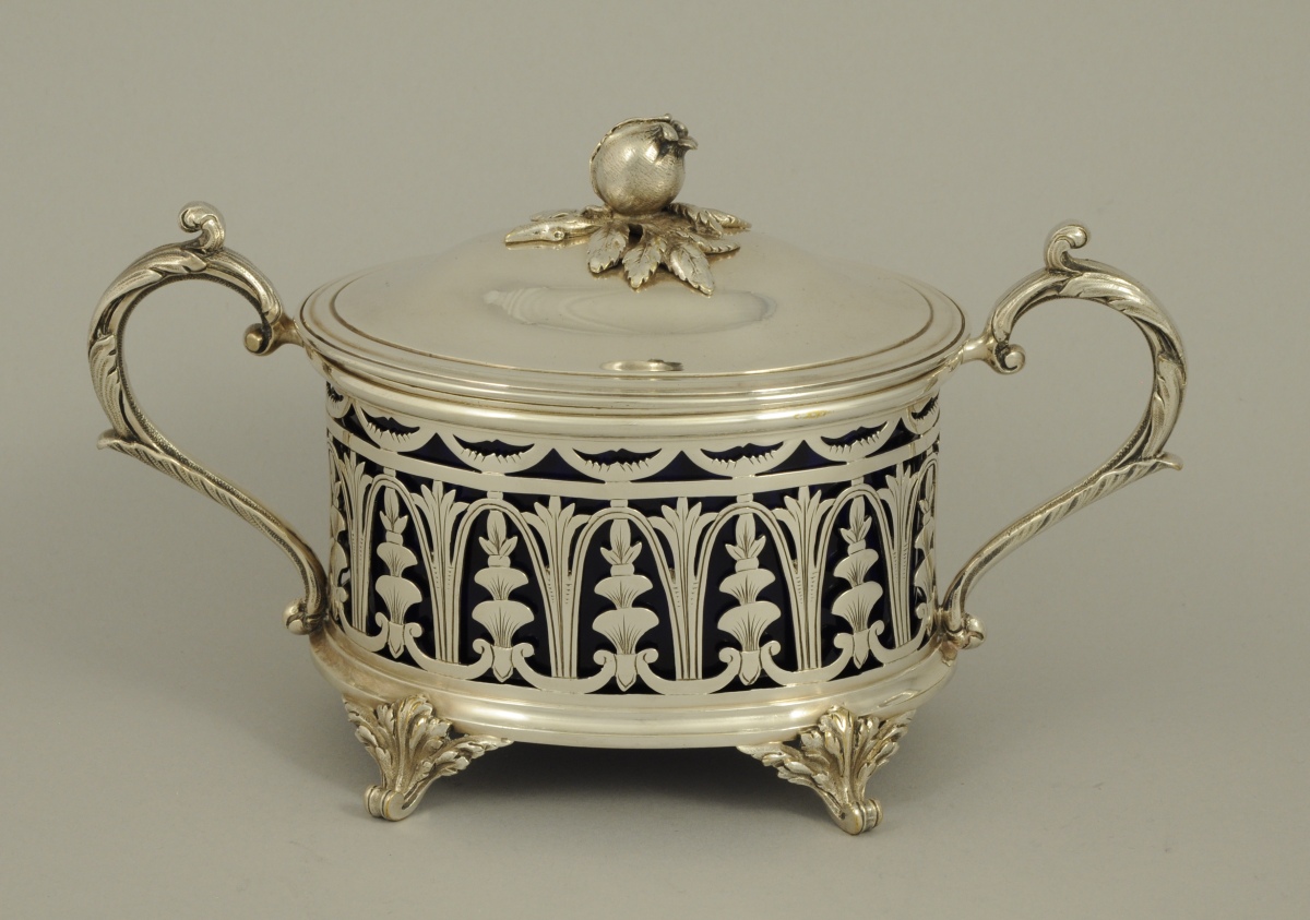 SUCRIER en métal argenté et verrine bleue. Corps ajouré à feuilles d'acanthe stylisées. Couvercle à filets et prise en forme de grenade. Il repose sur quatre pieds feuillagés.