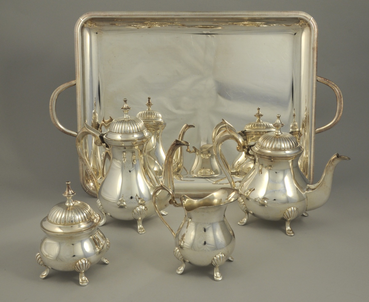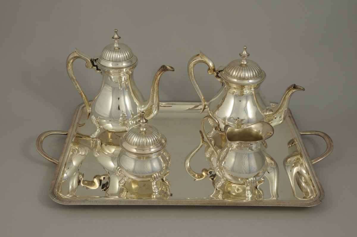 SERVICE À THÉ-CAFÉ en métal argenté comprenant une cafetière, une théière, un pot-à-lait et un sucrier. Repose sur des pieds à attaches godronnées. Les couvercles ornés de godrons.