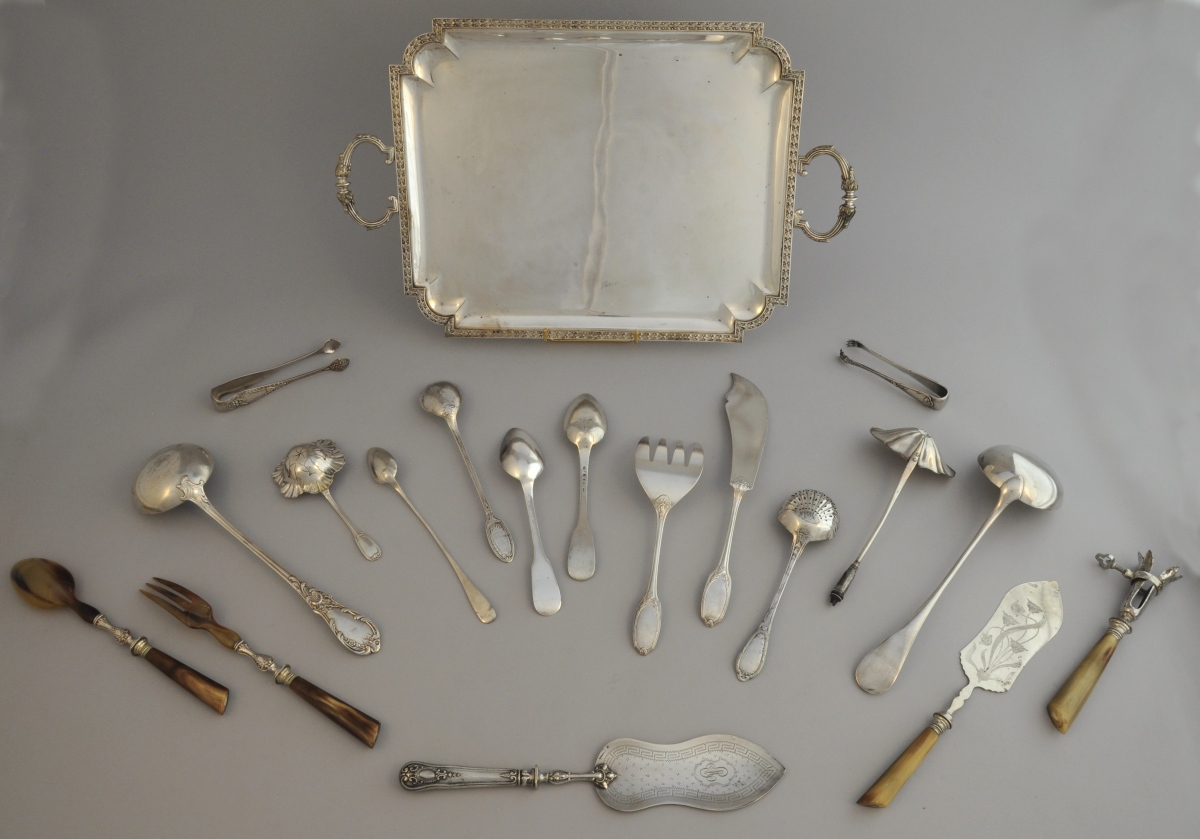 -PLATEAU DE SERVICE de forme rectangulaire de style Louis XVI, COUVERT DE SERVICE À SALADE, FOURCHETTE ET COUTEAU DE SERVICE À POISSON, PELLE À POISSON, manche en corne à décor de style Art Nouveau, MANCHE À GIGOT, manche en corne, PELLE À POISSON, 2 LOUCHES, 2 CUILLÈRES SAUPOUDREUSES, 2 PINCES À SUCRE, LOUCHE À PUNCH (manque le manche), CUILLÈRE À CRÈME, CUILLÈRE DE VERRE D'EAU, 2 CUILLÈRES DE TABLE.