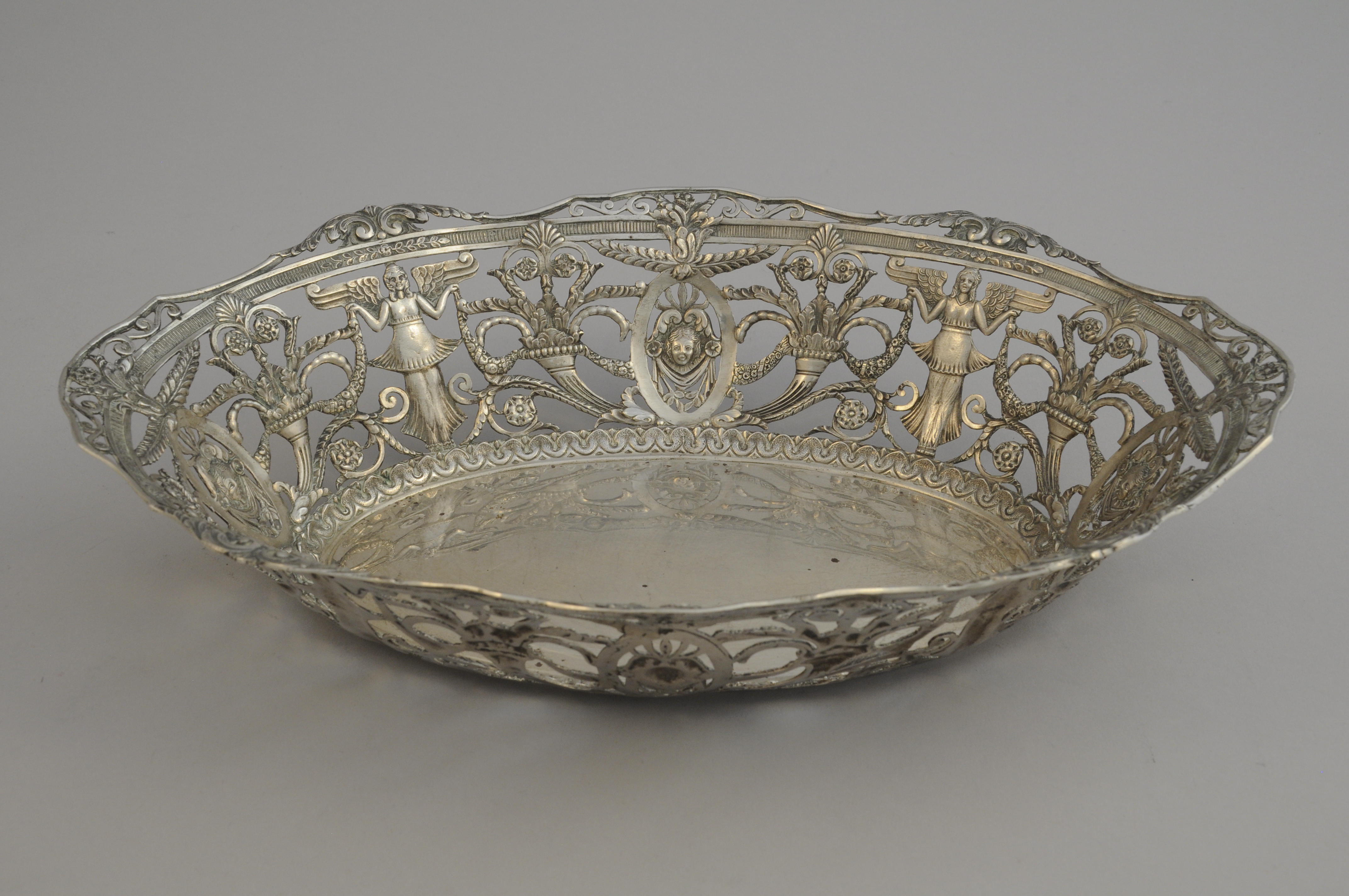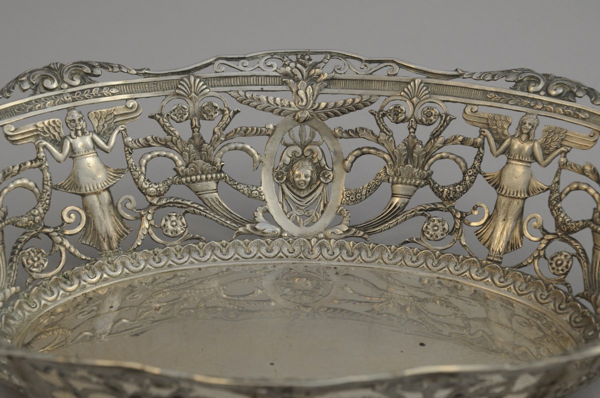 CORBEILLE À PAIN de forme ovale en argent. Riche décor ajouré de victoires, masques féminins, cornes d'abondance, palmettes, rinceaux, guirlandes de fruits et fleurons.